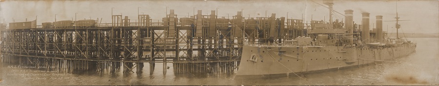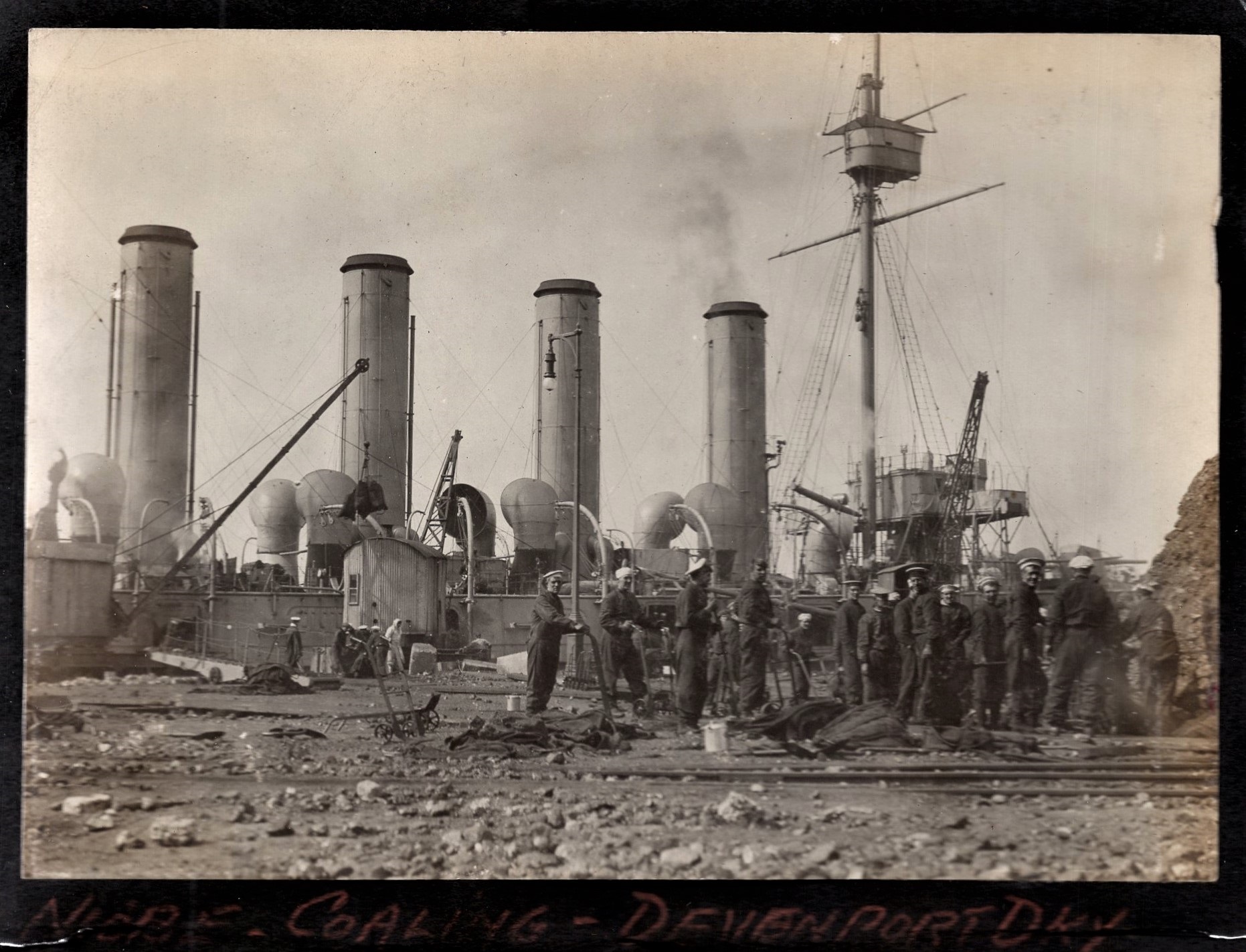 HMS CUMBERLAND 22,000 tons (with H.R.H. Prince Albert on board) bunkering at Dominion Coal Company's Pier Sydney, Nova Scotia, Canada, June 18th 1913