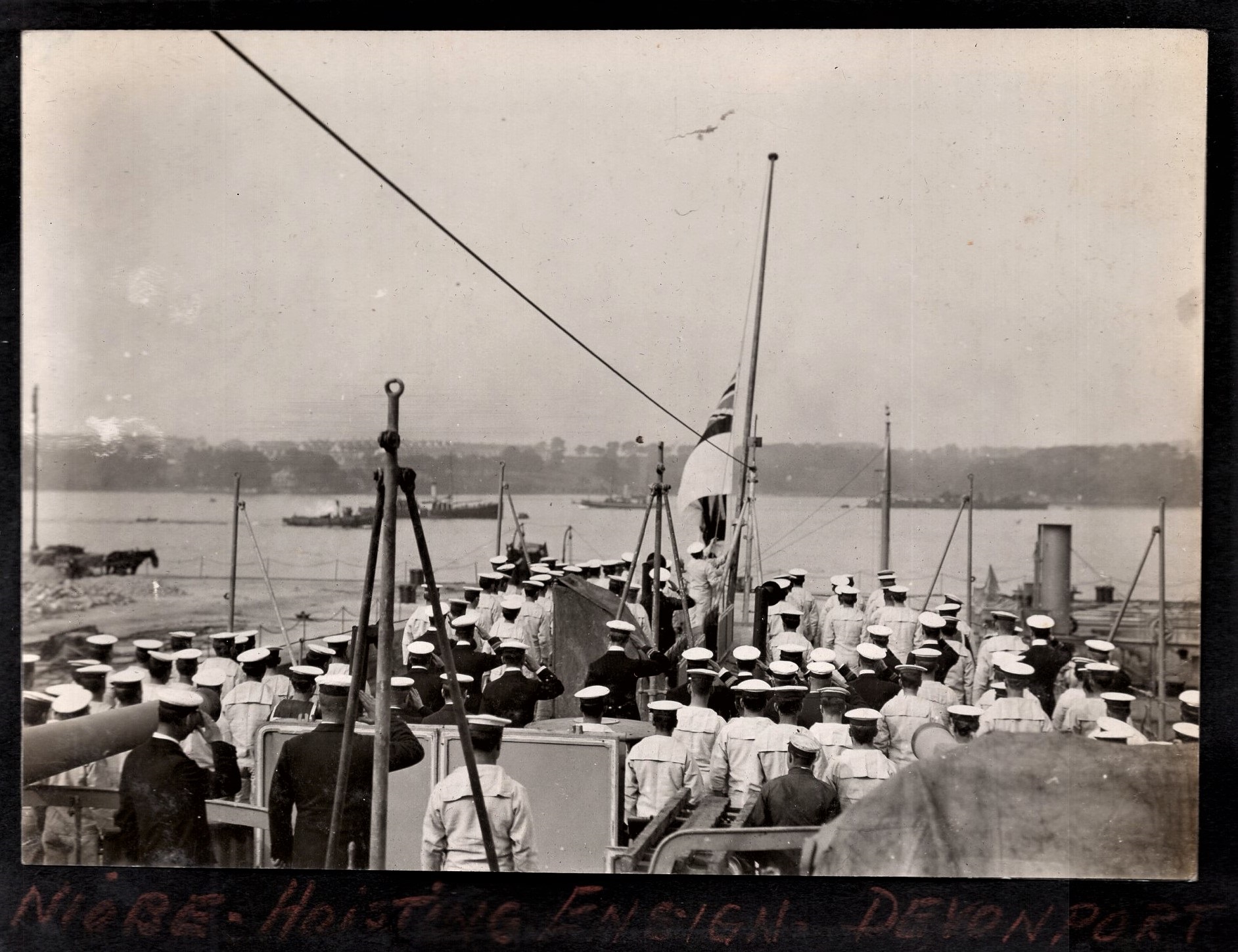 (NMoH-Niobe-001) Hoisting the White Ensign on HMCS NIOBE, Devonport, England (NMoH-Niobe-002) HMCS NIOBE coaling, Devonport Dockyard, England (NMoH-Niobe-003) "Quite Times" HMCS NIOBE in Halifax - 1910 (NMoH-Niobe-004) "Marching to Prayer" HMCS NIOBE (NMoH-Niobe-005) Mess deck on HMCS NIOBE