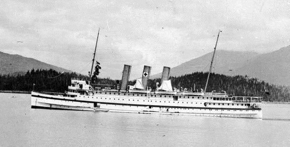 Jon Johnson reports (2015) that "The Royal Canadian Navy (RCN) led the world in commissioning the first WWI naval hospital ship, His Majesty’s Canadian Hospital Ship Prince George. The female nurses receiving RCN naval appointments for war service on Prince George were the first women in the RCN, first female officers in the RCN and first female naval officers to serve at sea. These Canadian naval achievements have quietly disappeared. Just days prior to the start of WWI the RCN began a search for a tender (fleet auxiliary) to support HMCS Rainbow. Rainbow, based at Esquimalt, BC, was the sole Allied warship in the north east Pacific Ocean when WWI was declared August 4, 1914. The nearest German warships were at Mazatlan, Mexico. A week later, the German Bremen class light cruiser SMS Leipzig visited the neutral port of San Francisco, CA, only one day after Rainbow had left the Farallone islands, 20 miles off San Francisco, for Esquimalt. Prompted by Naval Service of Canada in Ottawa to obtain a tender quickly, Royal Naval Canadian Volunteer Reserve (RNCVR) Lieut. G.H. Lifton with his party of armed bluejackets on CGS Galiano boarded Blue Funnel cargo liner SS Protesilaus at sea off Victoria, BC, and requisitioned her on August 4. Protesilaus was arriving from the Orient with passengers and freight, including silk. Upon posting a bond to ensure the ship’s return to Esquimalt Protesilaus was permitted to sail to Seattle, WA, to empty the ship prior to her naval service. She was under the control of RCN Lieut. A.M.K. Saul who had joined the RCN a few hours earlier. It was estimated that Protesilaus could be ready to operate as a tender by August 18. Within a few days there was concern that Protesilaus was unsuitable. She was twice the size of Rainbow. Consideration was then given to the suitability of the Canadian Pacific Railway coastal steamer SS Sophia. However, in the August 7, 1914, edition of The Vancouver Sun newspaper there was a notice that the Grand Trunk Pacific Railway (GTP) coastal steamer SS Prince George was being withdrawn from service and would be interned at Seattle, WA. Protesilaus was released from requisition and Prince George became the tender. Upon returning to Esquimalt from Seattle Lieut. Saul was placed in command of Prince George as he had his master’s certificate. The ship arrived at 0800 hours on August 8 and by 2000 hours was declared ready for naval service, as she was manned and provisioned. A telegram had arrived from Ottawa at 0400 that very morning stating: “Absolutely necessary tender be ready as hospital ship immediately. Expect action near Flattery [125km west of Victoria] within 48 hours. You must do all you can. If no stores ammunition on board can hoist red cross.” A hospital ship flying a Red Cross flag is exempt from attack which is not the case for a tender. One of Ottawa’s requirements for the tender was that she have good hospital accommodation implies something more than a basic sick bay found on naval ships. After a surgery was installed in the forward lounge and the elevators were modified to handle stretchers Prince George moved to Vancouver to obtain fuel oil and additional supplies. At Vancouver began the transformation to a naval hospital ship under the Geneva Convention. The hull was painted white with a broad green horizontal stripe. A red cross that had to be prominently displayed was put on the central funnel. And a Red Cross flag was to be flown from the forward mast. A ship has to be commissioned specifically as a hospital ship, a special designation within naval auxiliary vessels. In addition, hospital ship status was not complete until the belligerent nations are advised of the name of the hospital ship and its location. Prince George was commissioned August 11 and the notice to belligerent nations advising of her existence and location was sent August 12 making Prince George the first hospital ship to become operational after war began. Three British hospital ships, HMHS St. Andrew, St. David and St. Patrick were operational a week later. Lieut. Saul, was provided with a copy of the Geneva Convention relating to hospital ships. He was given orders to stay in touch with Rainbow, which he was able to do most of the time. When they met in person two weeks later Rainbow’s captain, Commander W. Hose, told Lieut. Saul “it was too gruesome to be followed about by a hospital ship all the time and [she] had better remain in Prince Rupert until she was required”. Manning Prince George under Lieut. Saul were 30 RNCVR seamen under a petty officer and three signalmen under a leading hand. RNCVR Lieut. H.G. Jarvis, purser, was in charge of supplies. Per the ship charter terms, GTP Captain Dan Donald stayed on as Master with his entire crew to operate the ship. Principal Medical Officer on Prince George was RNCVR Surgeon C.B. Wainwright. The hospital staff consisted of six RCN female Nurses, two RCN Sick Berth Stewards (SBS) and two RCN Ordinary Seamen as assistants to the SBSs. Elizabeth Pierce was appointed Acting Sister (army rank Acting Matron). Appointed Nurse (army rank Nursing Sister) were: Mabel Lindsay, Penelope Mellen, Annie Dover, Bessie Irving and Emma Black. Their appointments for war service on HMCHS Prince George were signed by Vice-Admiral C.E. Kingsmill, Director of the Naval Service of Canada. Interestingly, Lieut. Saul’s appointment was for war service on HMCS Shearwater, the Esquimalt naval base depot ship. The SBSs were H.S.H. Jones and D. Jones with R.E. Bush and F.O. Pattison as their assistants. Due to a lack of fuel oil at Prince Rupert on August 24 Prince George sailed to Ketchikan, AK, then Juneau, AK, in an unsuccessful attempt for more fuel oil. Then she was ordered to return to Vancouver to refuel then return to Esquimalt. On September 1, Prince George treated her only patient, a sailor with a broken leg from the Japanese armoured cruiser IJN Idzumo. The same day, after inspecting Prince George