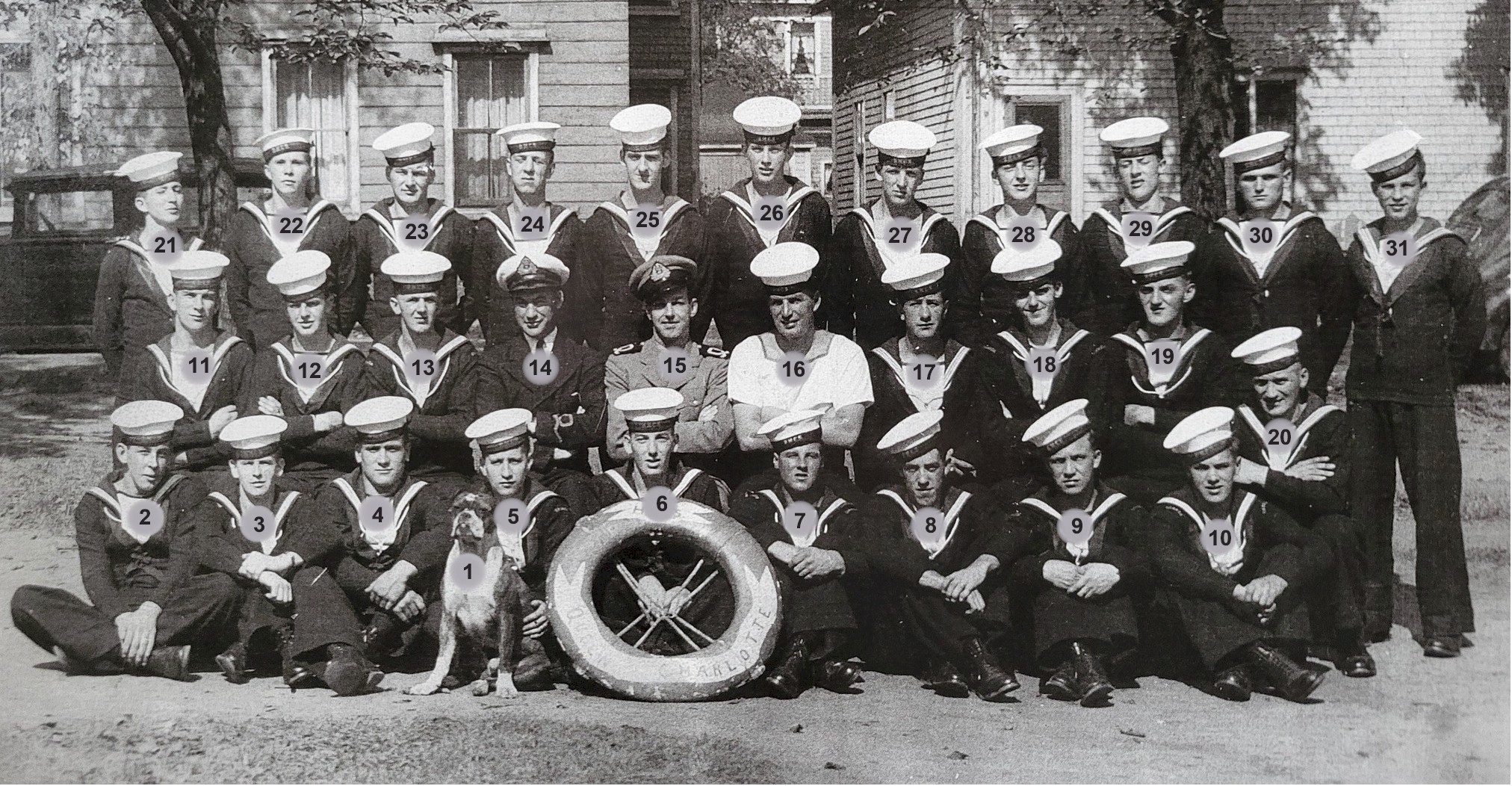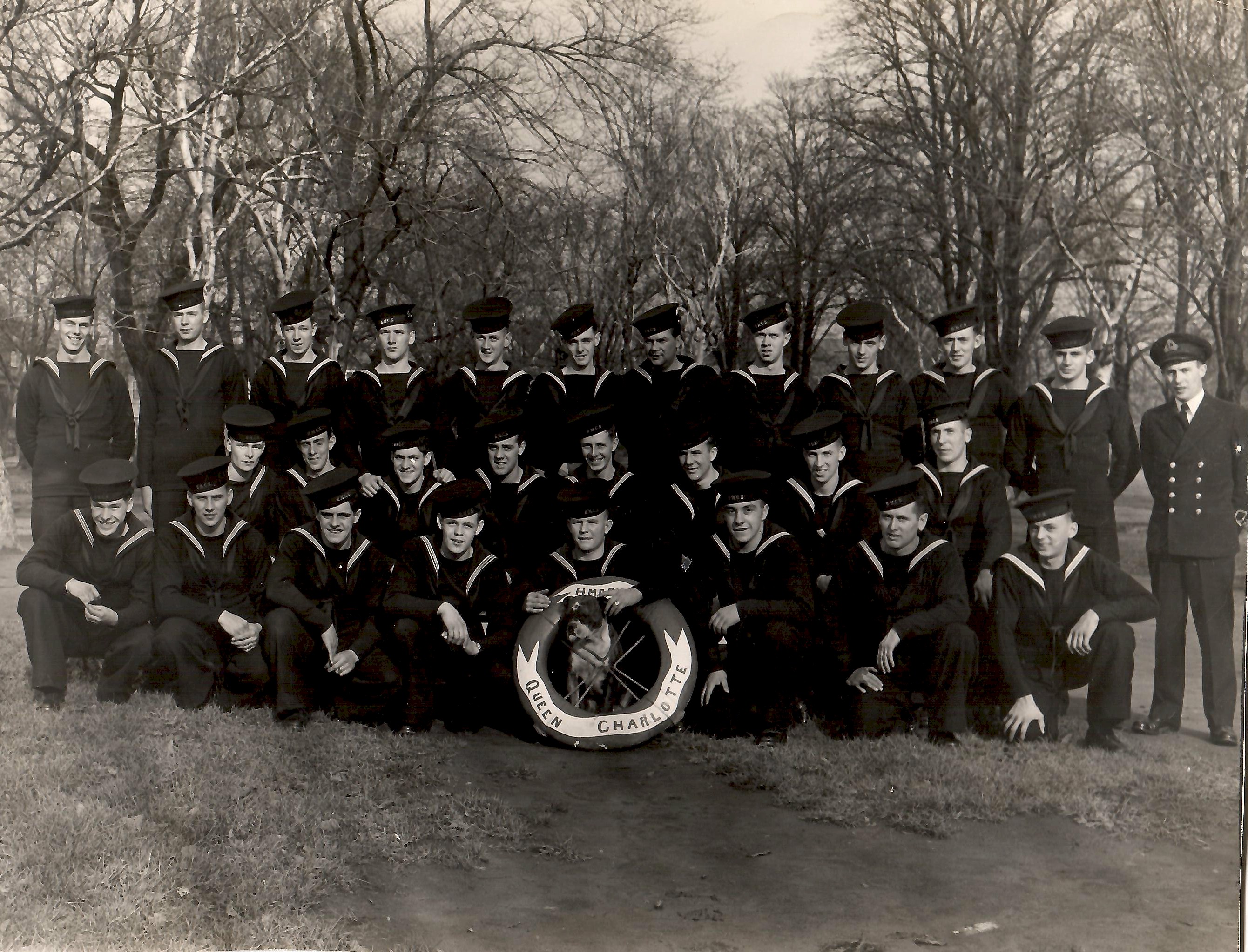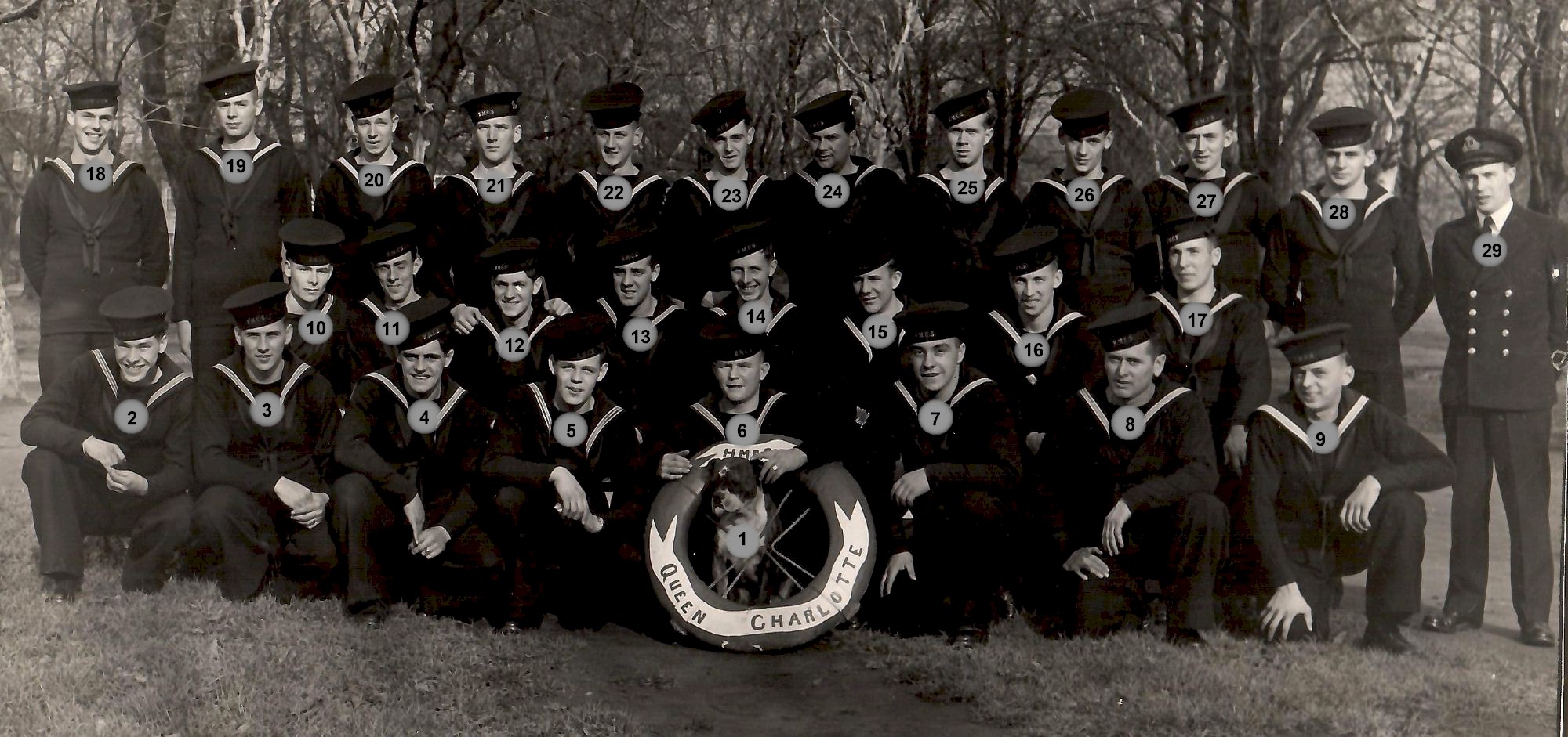 New Entry Course Undated HMCS QUEEN CHARLOTTE Click on the above photo to view a larger image Click here to view the photo with staff and students numbered for identification purposes (1) Ship's Mascot - name unknown (3) Barlow, Lowell Howard From the collection of Lowell H. Barlow, RCNVR Courtesy of Vickie MacCarville