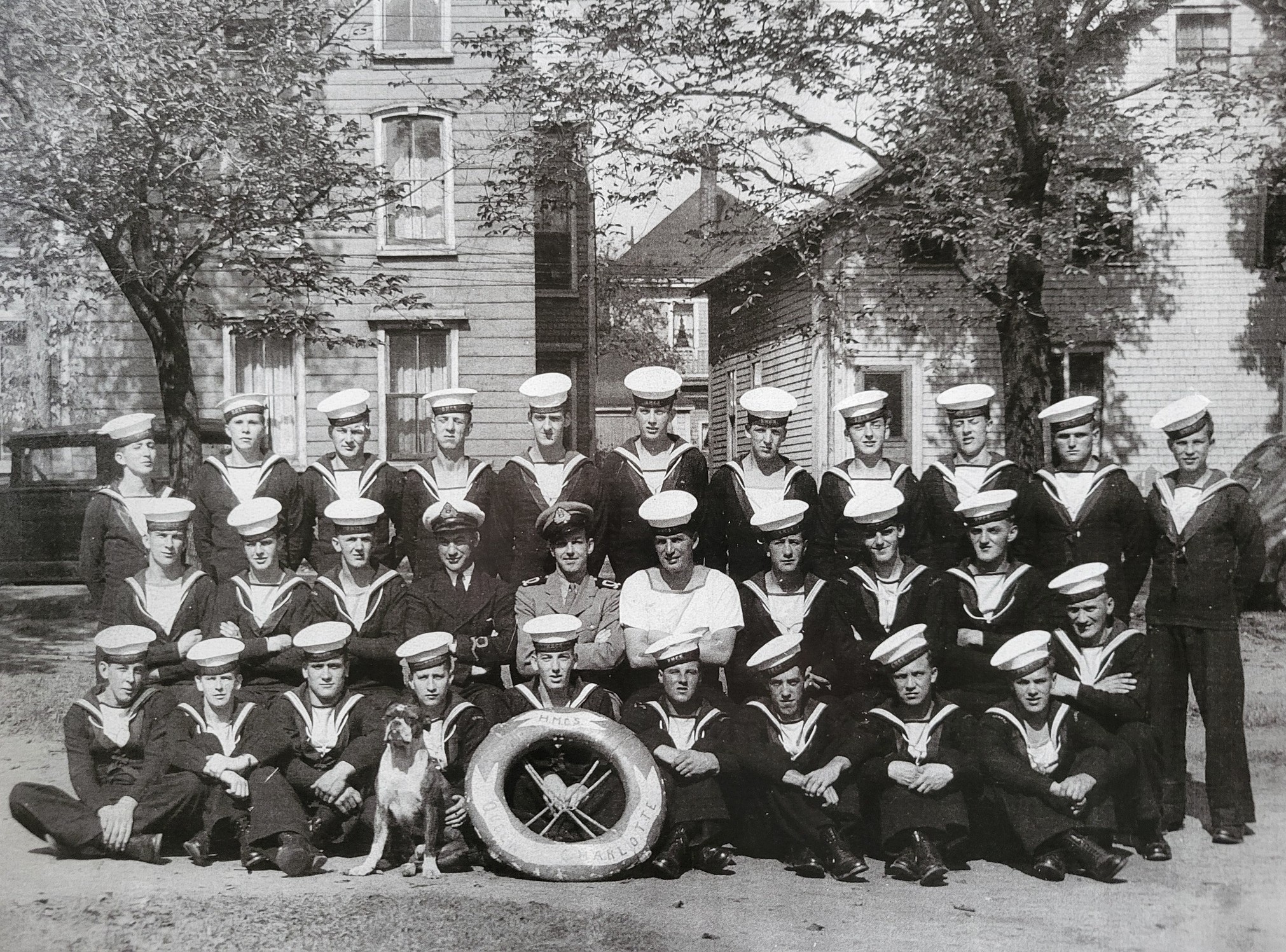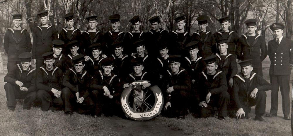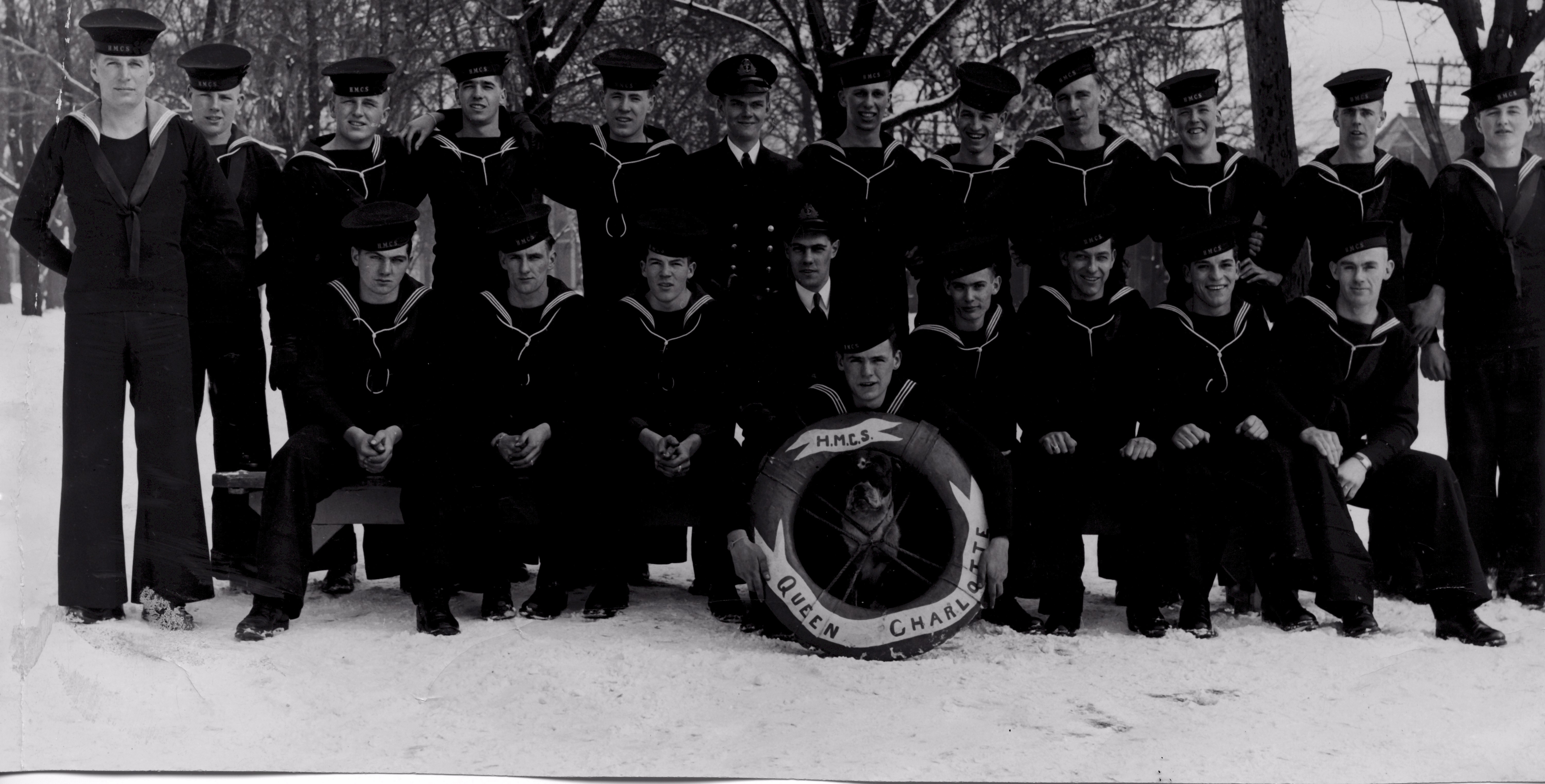 New Entry Course Undated HMCS QUEEN CHARLOTTE Click on the above photo to view a larger image Click here to view the photo with staff and students numbered for identification purposes (1) Ship's Mascot - name unknown (3) Barlow, Lowell Howard From the collection of Lowell H. Barlow, RCNVR Courtesy of Vickie MacCarville
