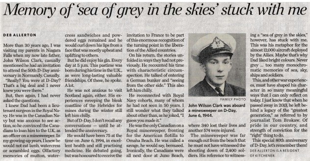 commemorative wreath for his ship, The Lindsay, at the cenotaph in