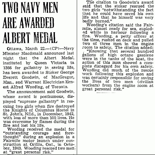 GOODWIN, George Everett, Albert Medal, Sto 2c, V30924, RCNVR - Son of Everett and Florence E. Goodwin of Vancouver, British Columbia. Husband of Mildred C. Goodwin of MacGregor, Manitoba. George died on 12 Dec 1942 in the fire at the Knights of Columbus Service Hostel in St. John's, NFLD. He is buried in the St. John's (Mount Pleasant) Cemetery.