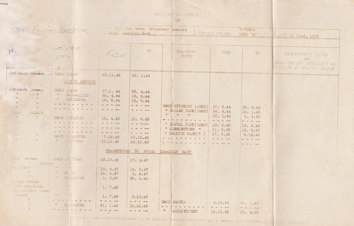 destroyers before he was assigned to HMCS Hespeler from the time it was