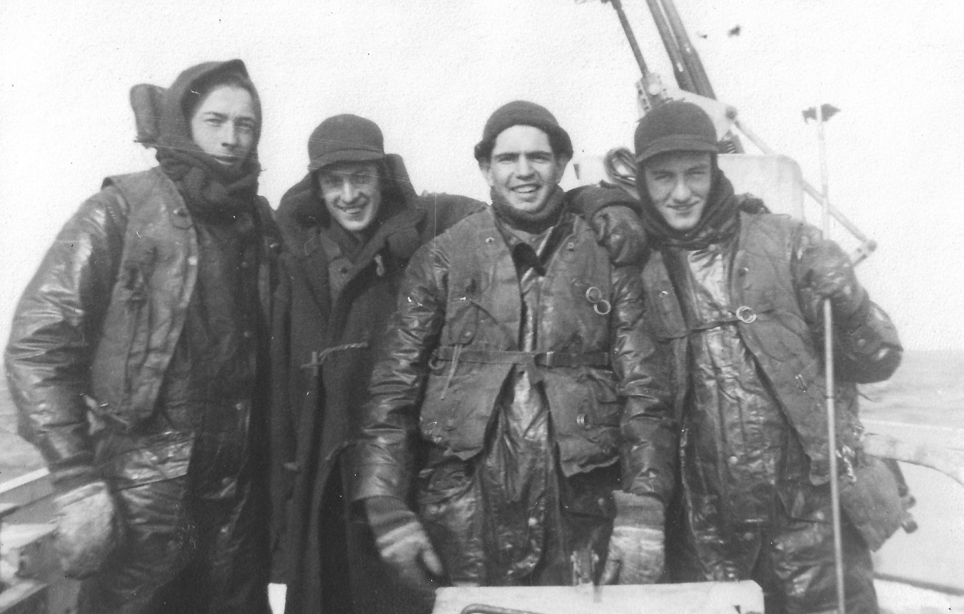 A cold day at sea on board HMCS Ste Therese K366 - 1945 // L-R: Moore,