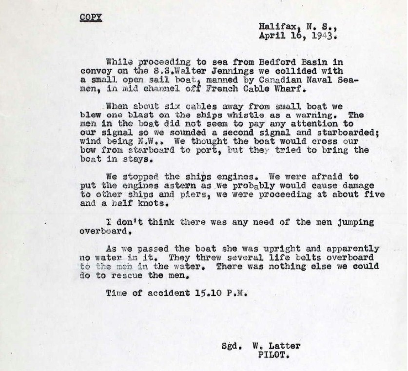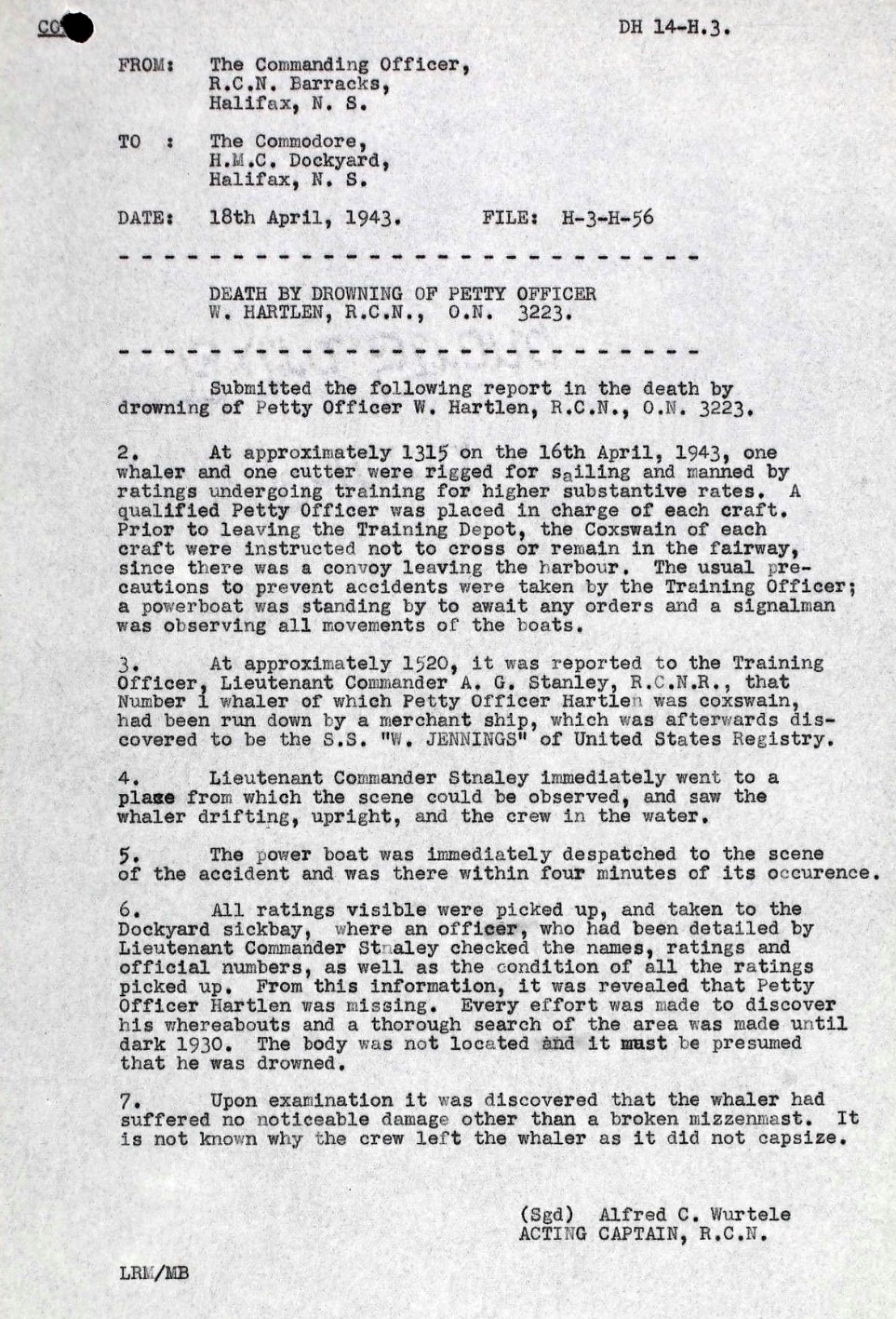 drowning in Halifax Harbour. Petty Officer Hartlen was the coxswain