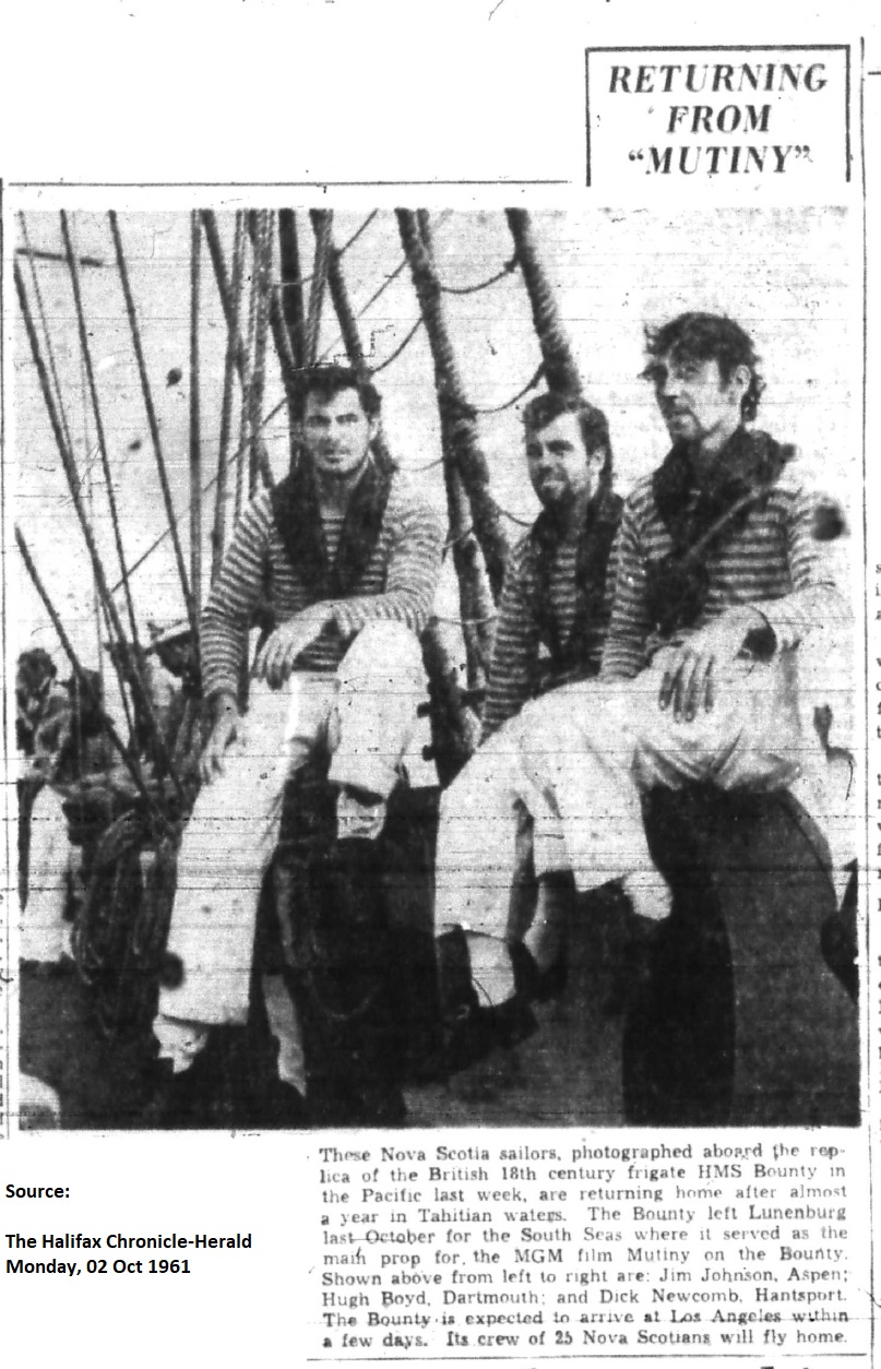 Article on Jim Johnson, Hugh Boyd and Dick Newcomb home after taking part in the movie Mutiny on the Bounty on the replica of the frigate HMS BOUNTY