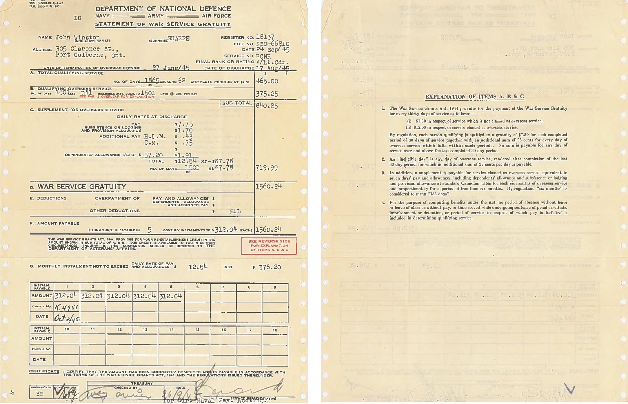 (JS01) War Service Gratuity documents for LCdr John Sharpe