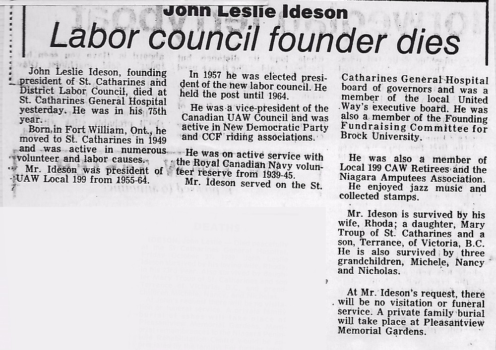 IDESON, John Leslie, Chief TGM (demobilized 19 Oct 1945) - Died peacefully at the St. Catharines General Hospital, Friday October 27, 1989 in his 73rd year. Survived by his loving wife Rhoda. Also survived by daughter Mary Troup of St. Catharines and son Terrance of Victoria, BC and grandchildren Michele, Nancy, and Nicholas. At John's request there will be no visitation or funeral service. A private family burial  of ashes will take place at Pleasantview Memorial Gardens. Memorial remembrances to the Niagara Peninsula Rehabilitation Centre would be appreciated by the family.