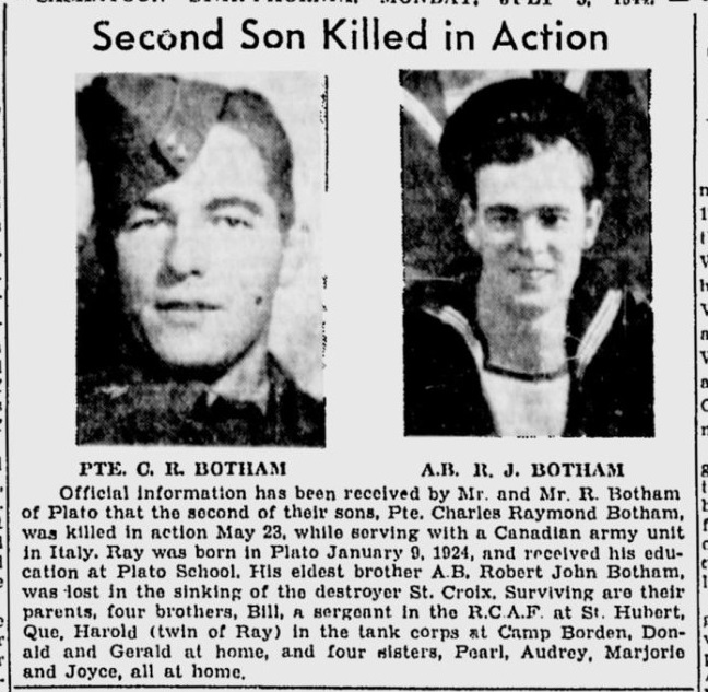 Able Seaman Robert John Botham was born at Melfort, Saskatchewan and was farming when he enlisted on October 21, 1941 at Saskatoon Saskatchewan. Brother of Private Charles. R. Botham with Princess Patricia's Canadian Light Infantry, R.C.I.C. was killed in Italy on May 23, 1944. They were the sons of Robert Samuel and Doris Lillian Botham. Both boys were farming when they enlisted. Besides the parents there are four other brothers, Sgt. William in the R.C.A.F. at St. Hubert, Que.; Harold twin brother of Pte. Raymond, in the Canadian Tank Corps.at Camp Borden; Donald and Gerald at home and four Audrey, Margery and Joyce at home.