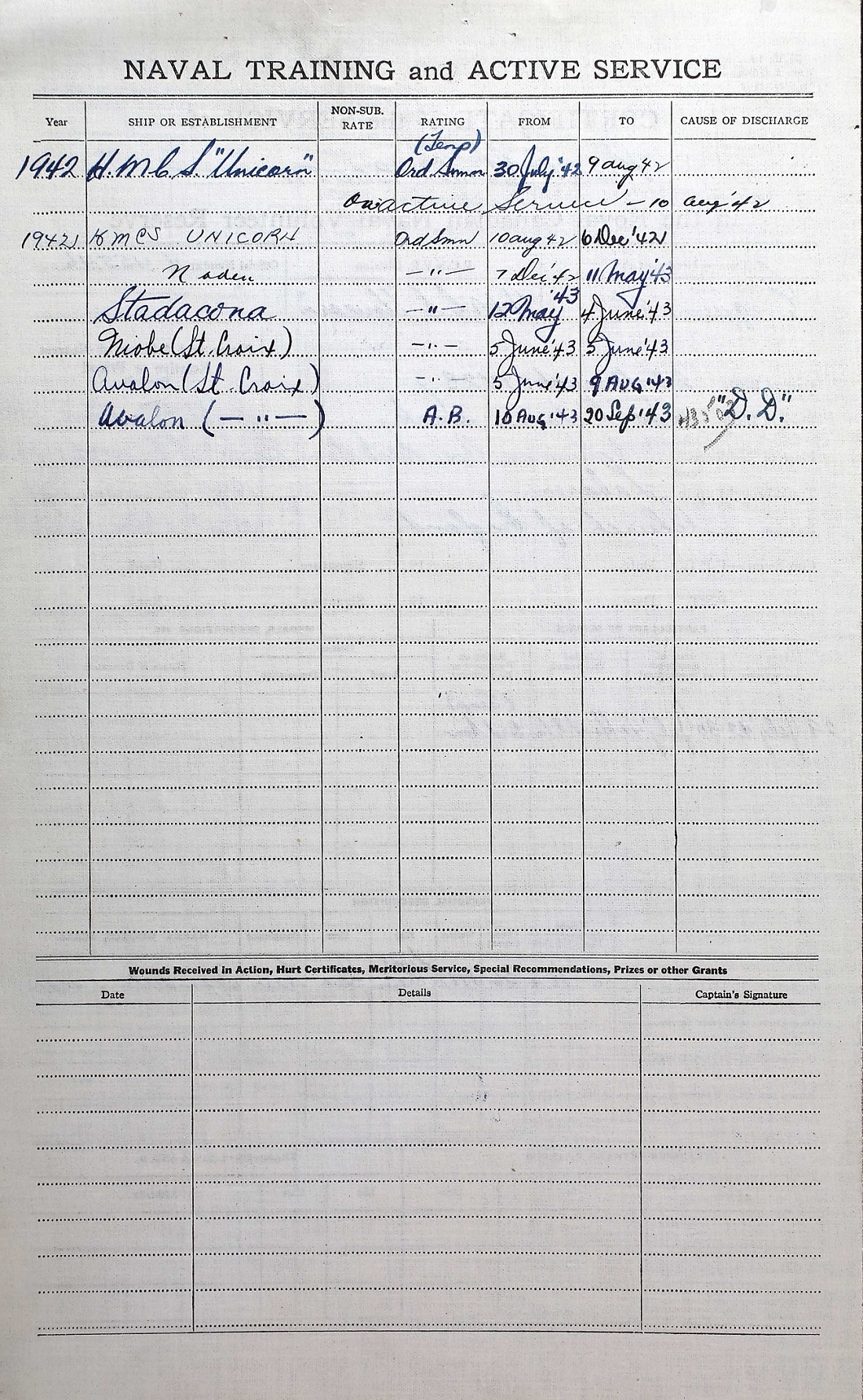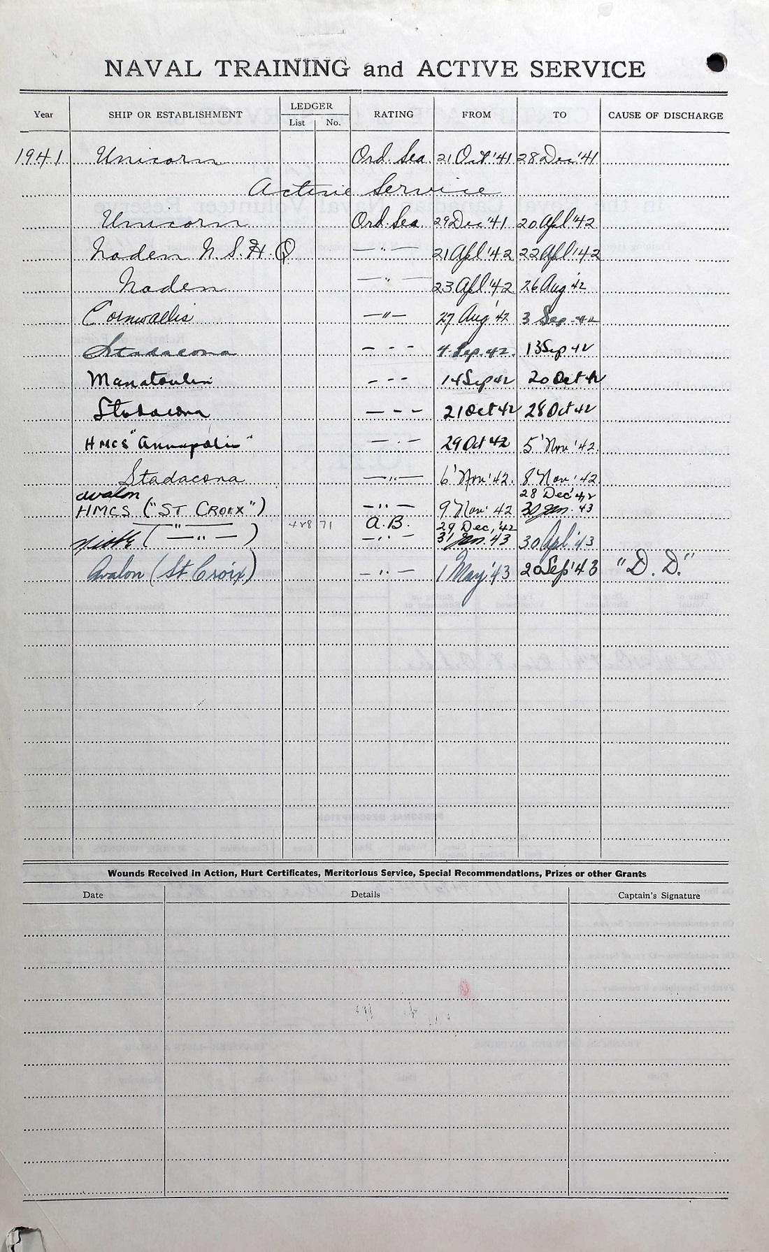 HMCS OTTAWA - Appointed to Ottawa 08 Jun 1941 as A/Gnr (T), RCN.  Survived the sinking of HMCS OTTAWA