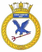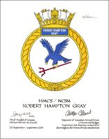 Significance: The eagle descending on its prey is taken from the badge of 1841 Naval Air Squadron of the Royal Navy, with which Lt Robert Hampton Gray, a pilot of the Royal Canadian Naval Volunteer Reserve, served. The trident is taken from the badge of HMS Formidable, the ship from which the squadron operated. Its deep red colour refers to the ribbon of the Victoria Cross awarded posthumously to Lt Gray for his valour in leading an air attack on a Japanese destroyer in August 1945. The white background refers to the Arctic environment in which HMCS Robert Hampton Gray will operate.