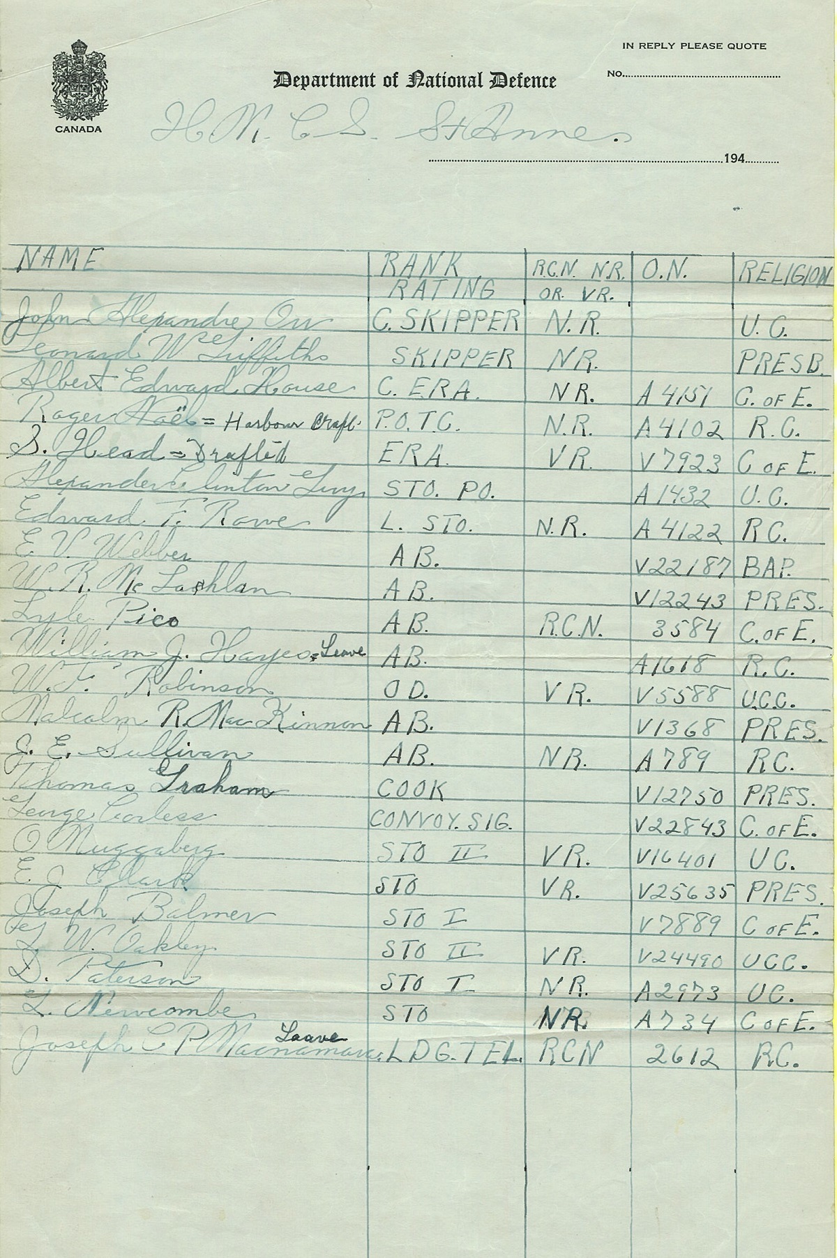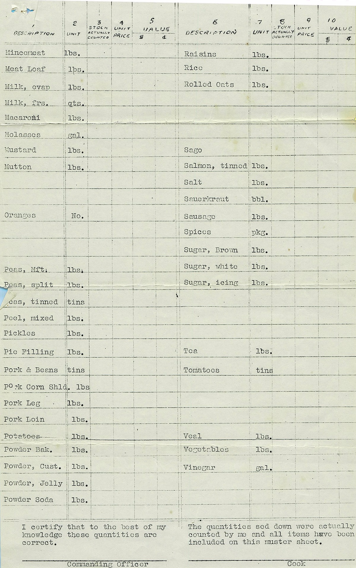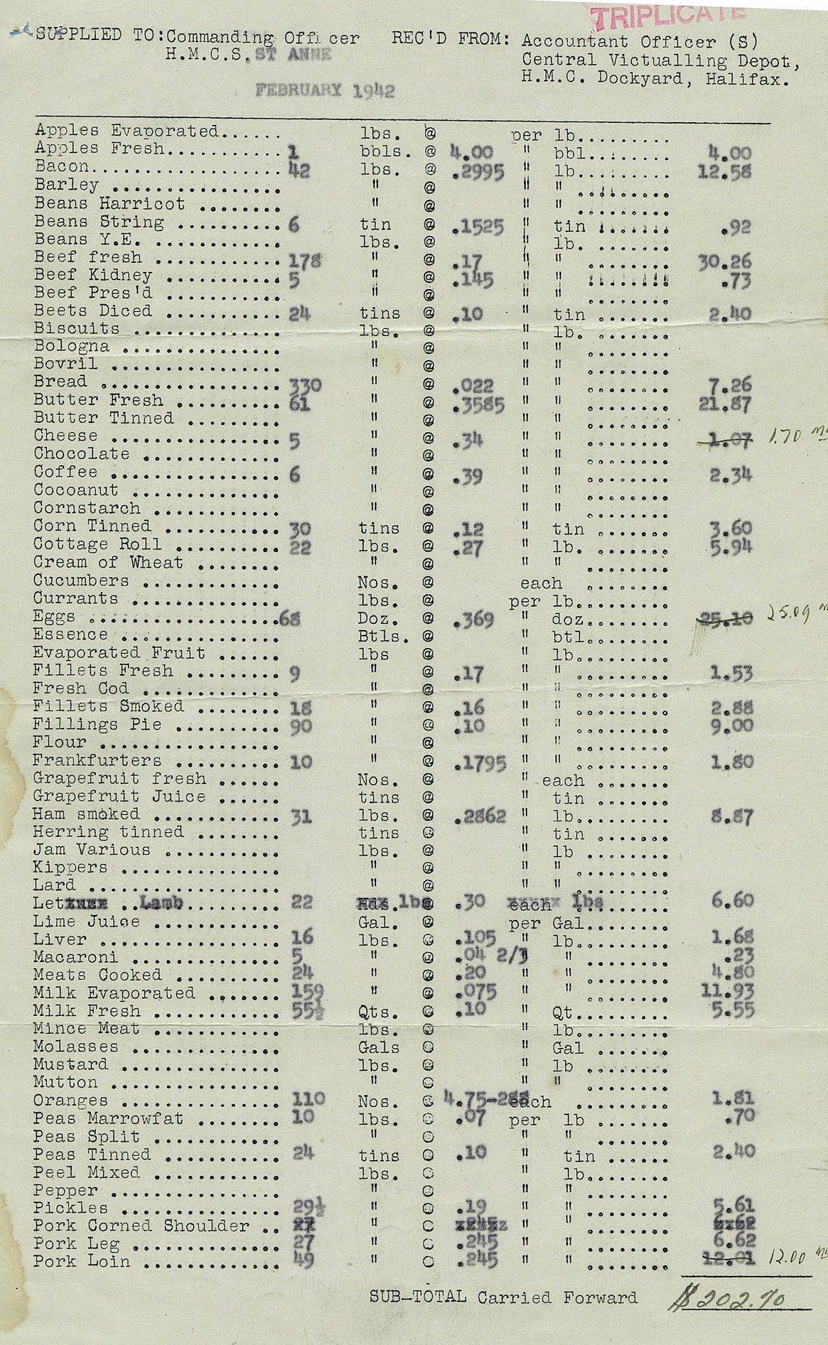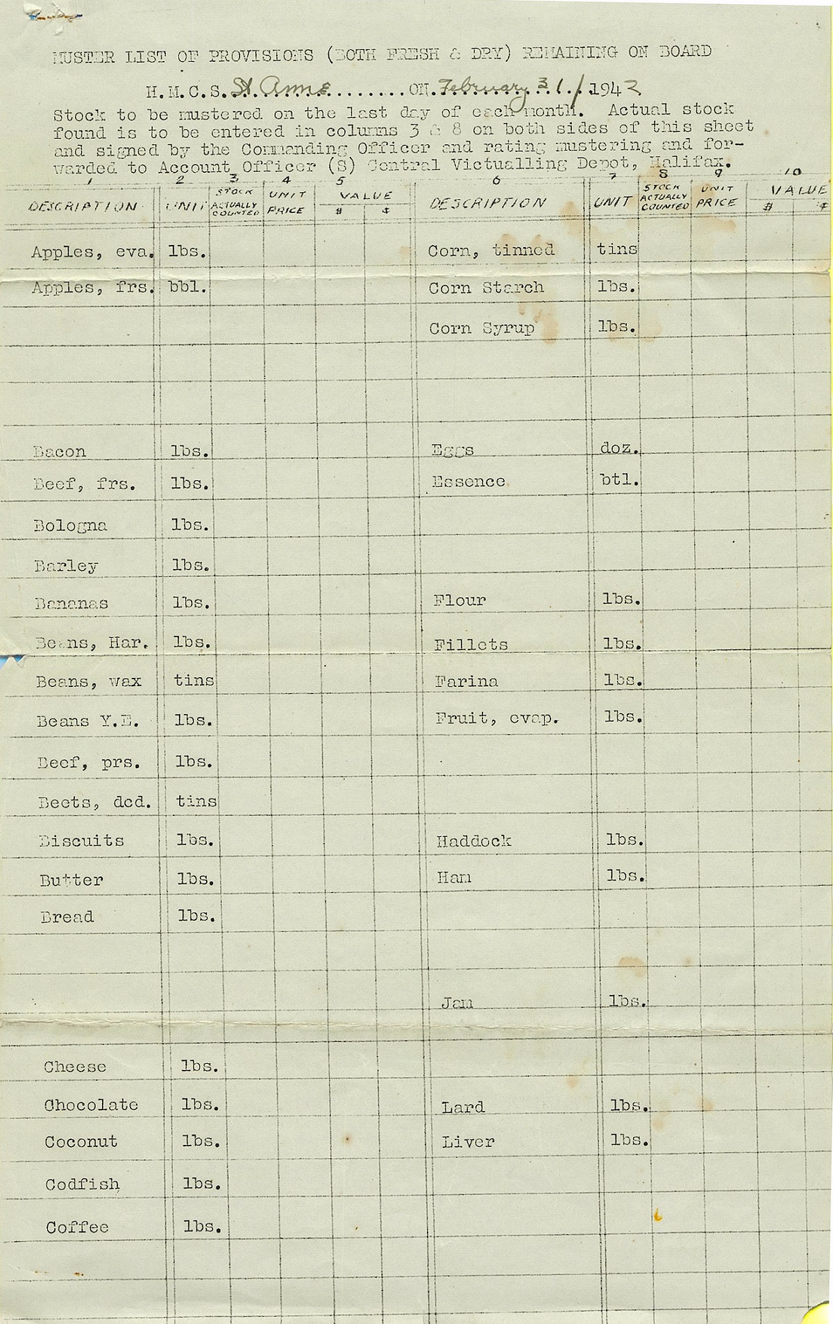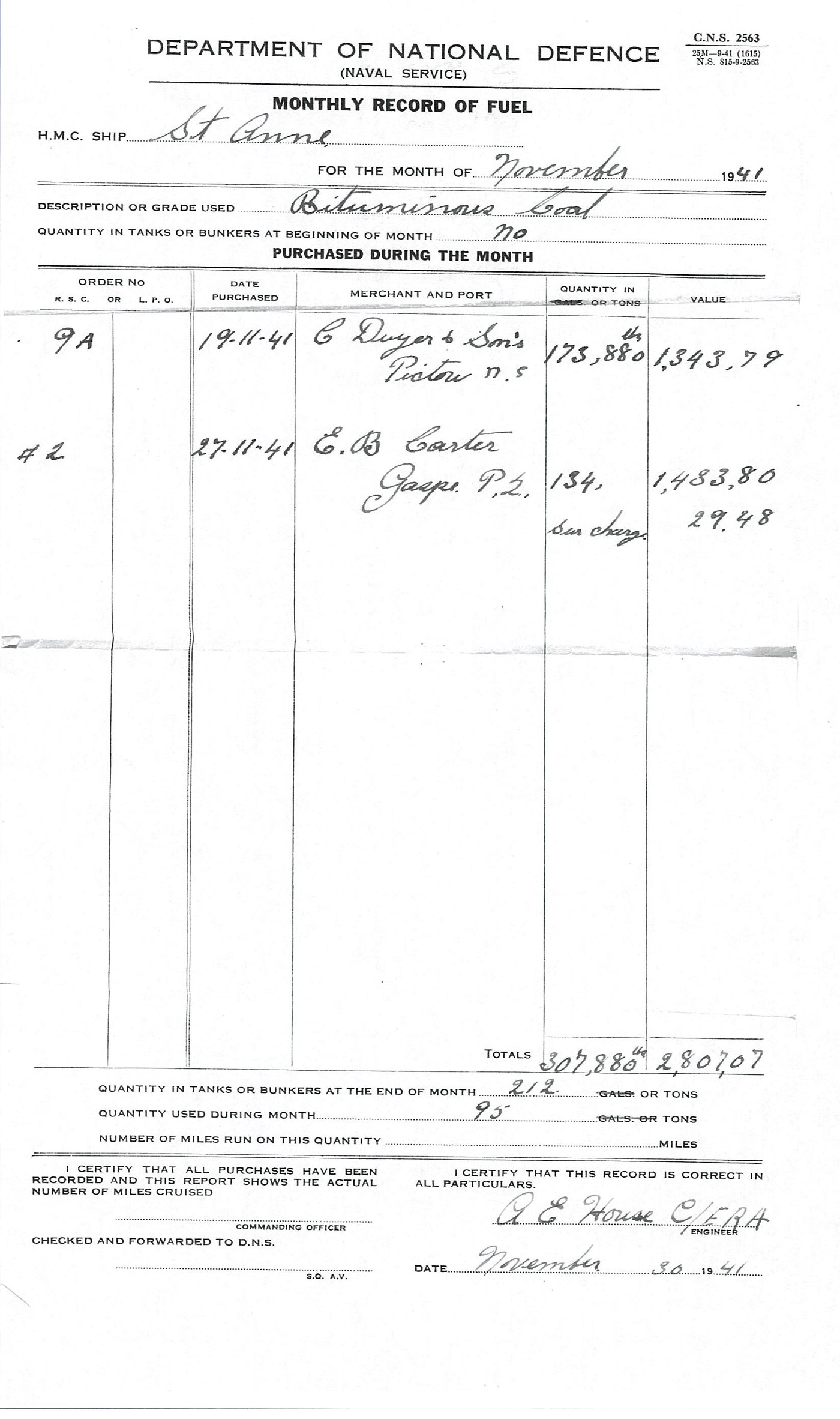 (JO-09) Monthly record of fuel for the tug HMCS ST ANNE dated 30 Nov 1941 signed by A.E. House, C/ERA (JO-10) Ration Indent for HMCS ST ANNE dated 17 Jan 1942 (JO-11 & JO-12) Muster list of provisions (both fresh and dry) remaining onboard HMCS ST ANNE on 31 Feb 1942
