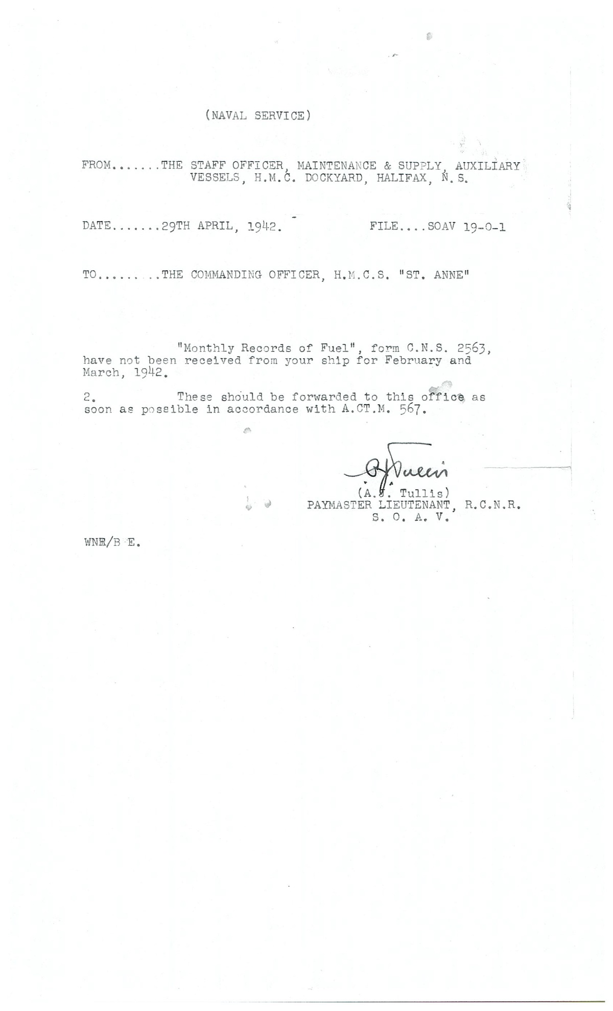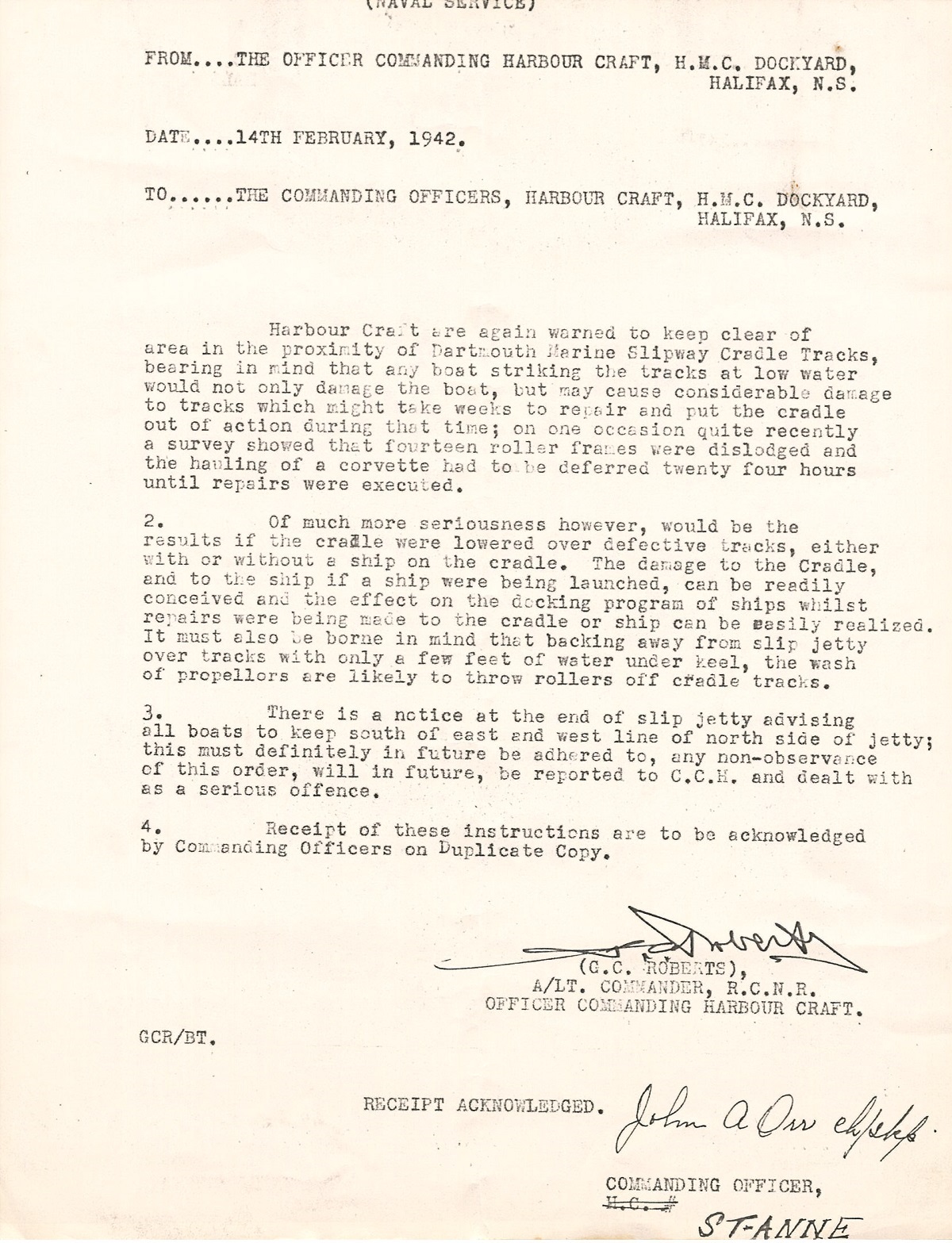 (JO-13 & JO-14) Supply verification form from Central Victualling Depot HMC Dockyard, Halifax dated Feb 1942 - signed by Skpr L.W. Griffiths, Acting for CO (JO-15) Request for HMCS ST ANNE'S February and March monthly fuel record dated 29 Apr 1942 (JO-16) Letter, dated 14 Feb 1942, to the Commanding Officers of all Harbour Craft to keep clear of the Dartmouth Slipway Cradle Tracks to prevent damage to their boat and the tracks.