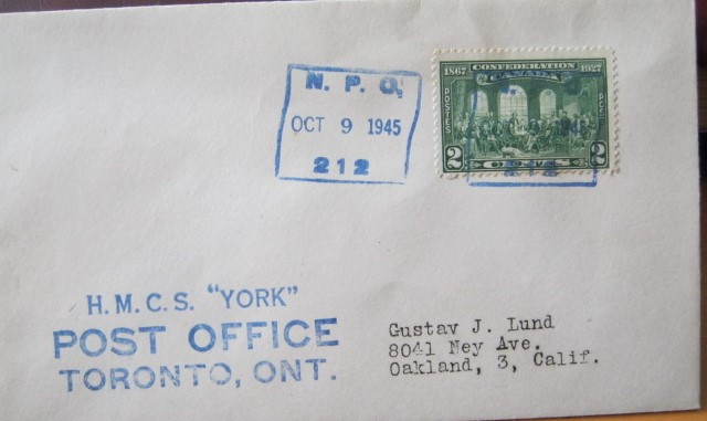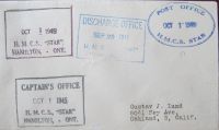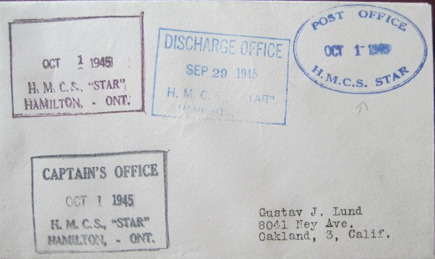 Two envelopes addressed to Gustav J. Lund in Oakland, California, USA with various stamps from HMCS STAR dated 01 and 09 Oct 1945 respectively Courtesy of Dave Upright