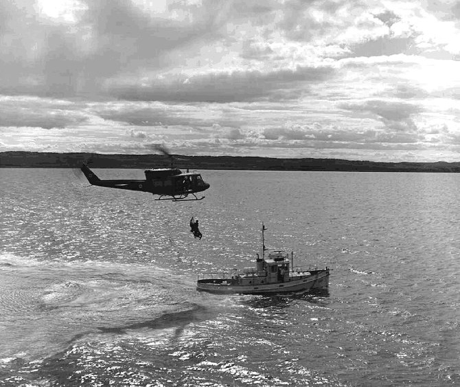 (ADM001) A Huey helicopter from 408 Squadron lifts a pair of SAR Techs from CFAV BURRARD while working jointly with the Naval Reserves from HMCS NONSUCH, Sept 1980 // DND photo # IE80-210 // Source: From page 166, Appendix A: Vessels of the Naval Reserve of Canada, Citizen Sailors: Chronicles of Canada's Naval Reserves, 1910-2010 edited by Richard Howard Gimblett, Michael L. Hadley // Courtesy of Leigh Cossey (ADM002) Former CFAV BURRARD in storage in Winnipeg // Photos from www.kleamanmarine.com // Courtesy of Leigh Cossey (ADM003) Former CFAV BURRARD after arrival in Vancouver // Photos from www.kleamanmarine.com // Courtesy of Leigh Cossey (ADM004) Former CFAV BURRARD after conversion by Kleaman Marine, Deep Cove, North Vancouver BC. Working in the Nass River BC Area c. 2007 // Photos from www.kleamanmarine.com // Courtesy of Leigh Cossey