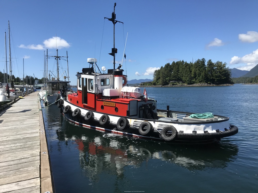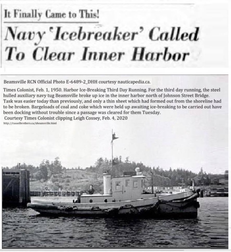 (BMV001) The Tug BEAMSVILLE performs the duty of icebreaker to clean Victoria's Inner Harbour // Article from the Victoria Times Colonist - 1950 (BMV002) Tug BEAMSVILLE, Esquimalt, BC - 12 May 1986 // Photo credit: Mac Mackay // Courtesy of Leigh Cossey (BMV003) Tug BEAMSVILLE, Tofino, BC - 12 July 2018 // Marcel says he purchased her in 2014, she had been on the hard for three years. A Texas Nozzle had been installed before purchase. Had no stern fendering. In 2014 he installed a Schuyler stern fender. In 2017 an engine room refit was done. Used for vessel assist and general towing. Powered by a 6-71 Detroit Diesel. // Photographer Marcel Theriault // Courtesy of Leigh Cossey (BMV004) BEAMSVILLE towing Lady Rose from Tofino to Sechelt, BC Oct 27 to Nov. 6, 2019, 285 nautical miles. Down the west side of Vancouver Island, through the Strait of Juan de Fouca and up the Strait of Georgia // Photographer Liam O'Kiely // Courtesy of Leigh Cossey (BMV005) BEAMSVILLE, Tofino BC, Jan 2020 // Photo by Ciara_salvage on Instagram // Courtesy of Leigh Cossey