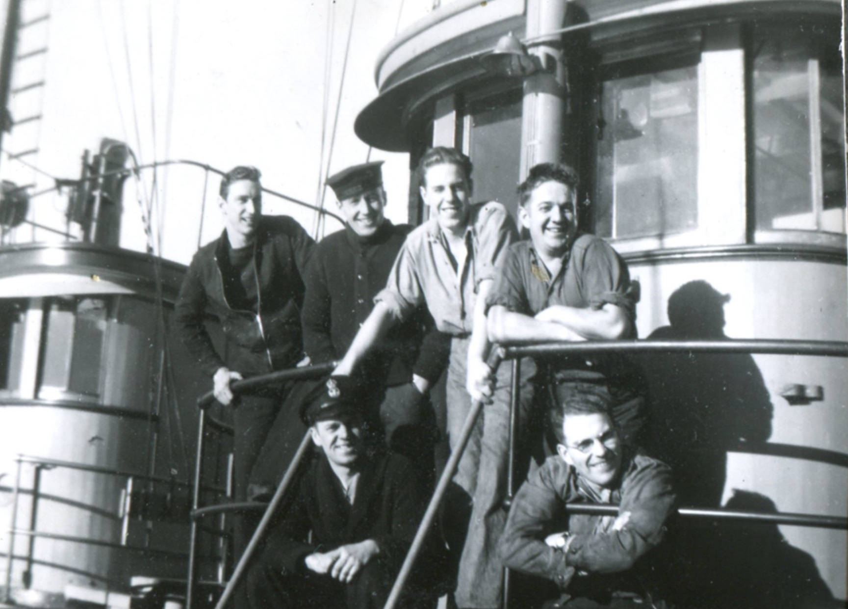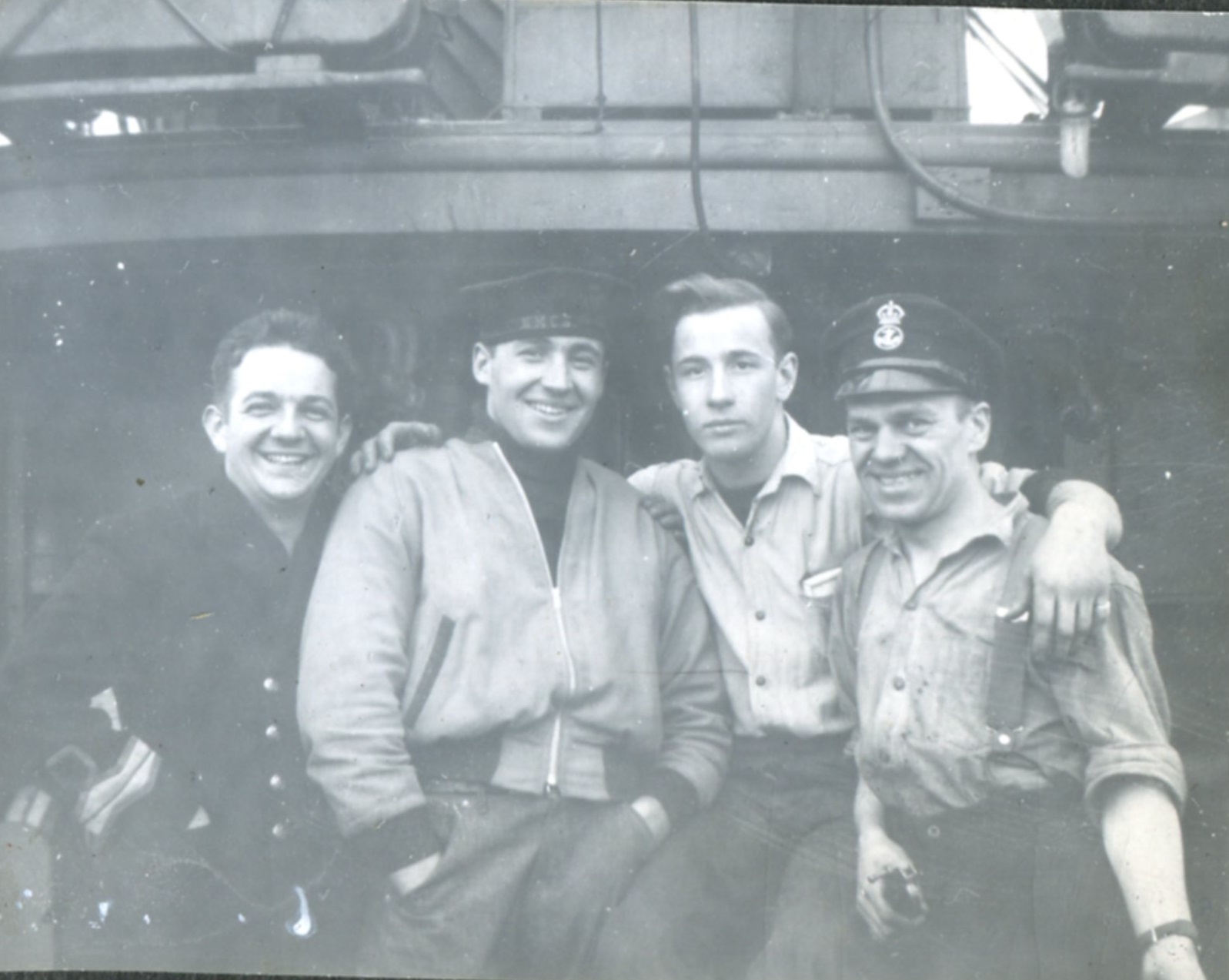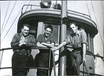 (GC07) Tony Kalichuck "Swain" (GC08) Ted Dalton by the winch on the GLENDON (GC09) Tubby Buchanan wearing an officer's uniform onboard the GLENDON (GC10) Unknown sailor wearing an officer's uniform onboard the GLENDON (GC11) Dunc Rew (left) and Lou Broten onboard the GLENDON