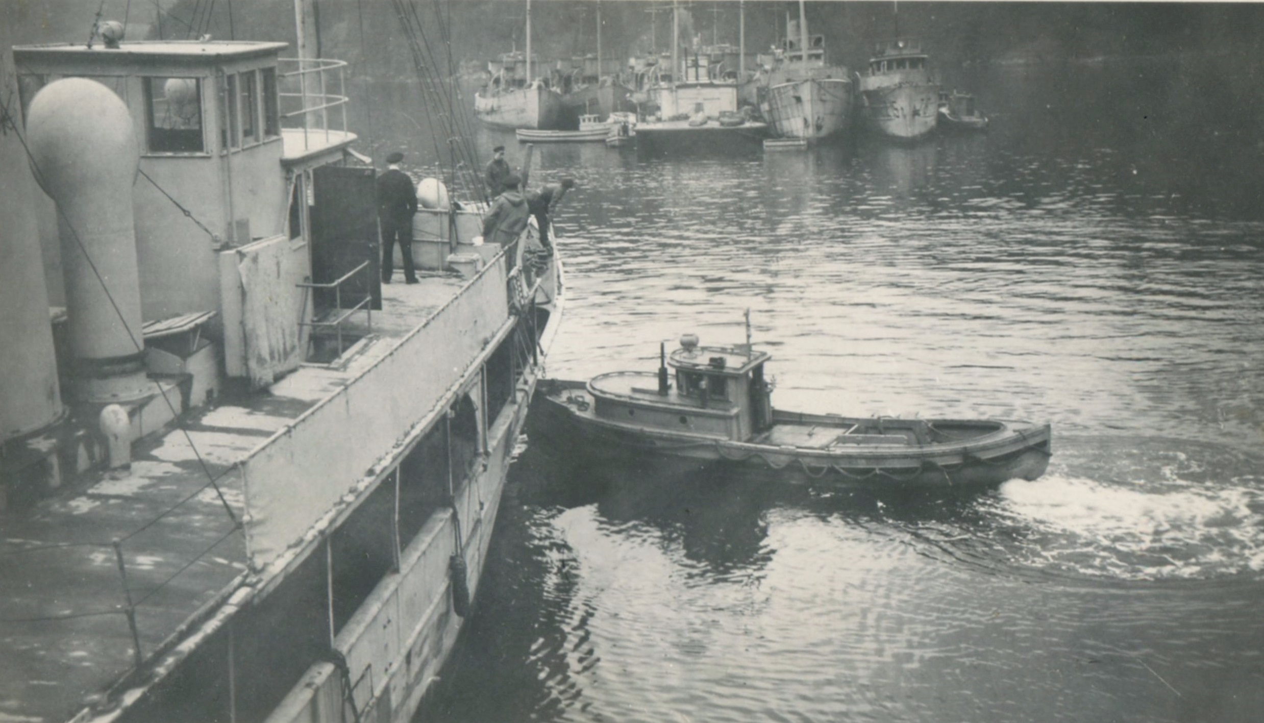 (GC12-GC13) Queen Charlotte Sound "and it isn't rough yet" (GC14) HMCS WOLF being assisted alongside by the tug GLENDON (not visibly in photo) and smaller yard tug (GC15) Minesweepers nested in Esquimalt. HMCS QUATSINO J152 outboard ship on the left