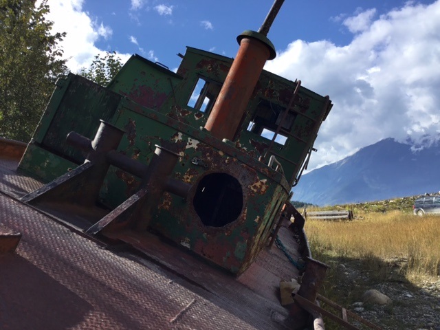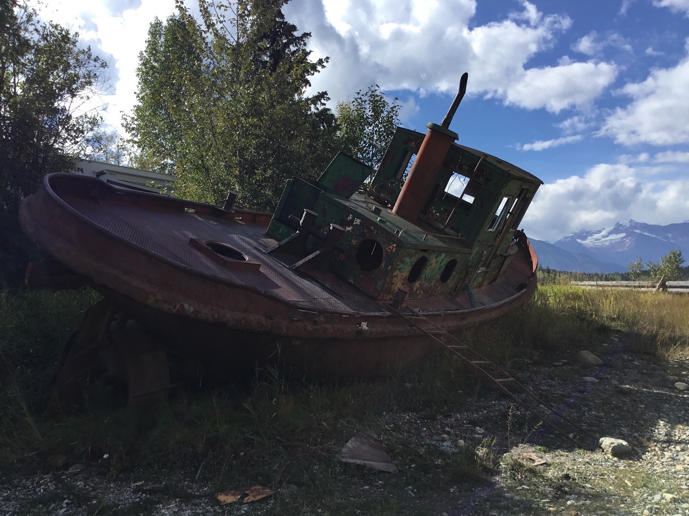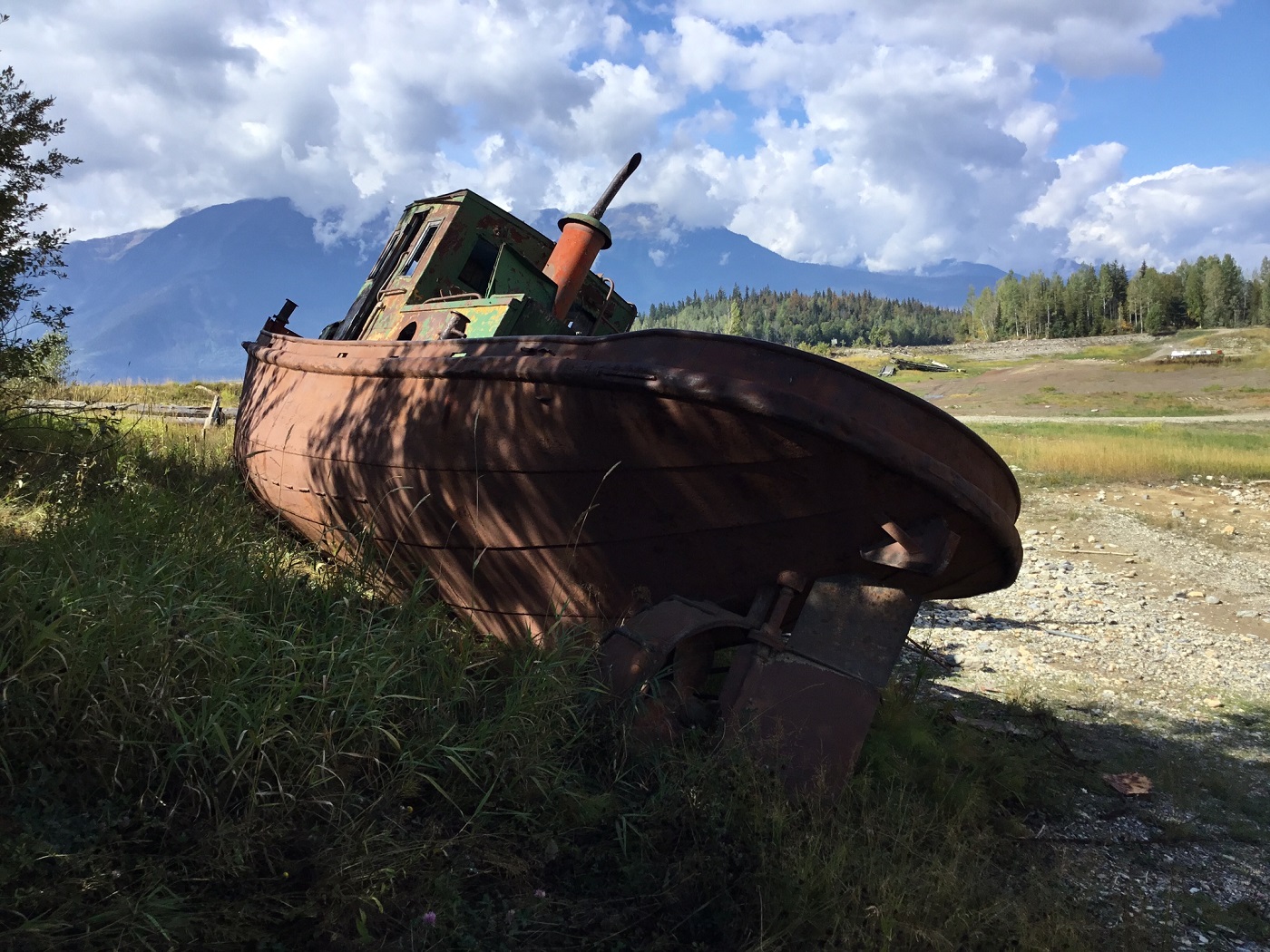 The tug Navvy Jack (II) (former RCN Tug Hartville) sits abandoned on the shores of Kinbasket Lake near Golden, BC. Photographed on 08 Sep 2018