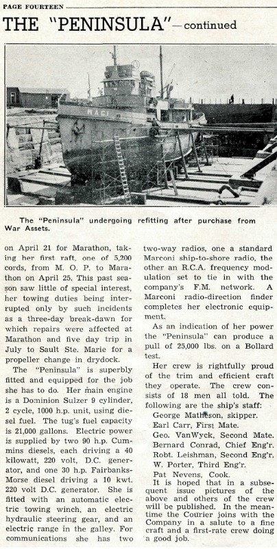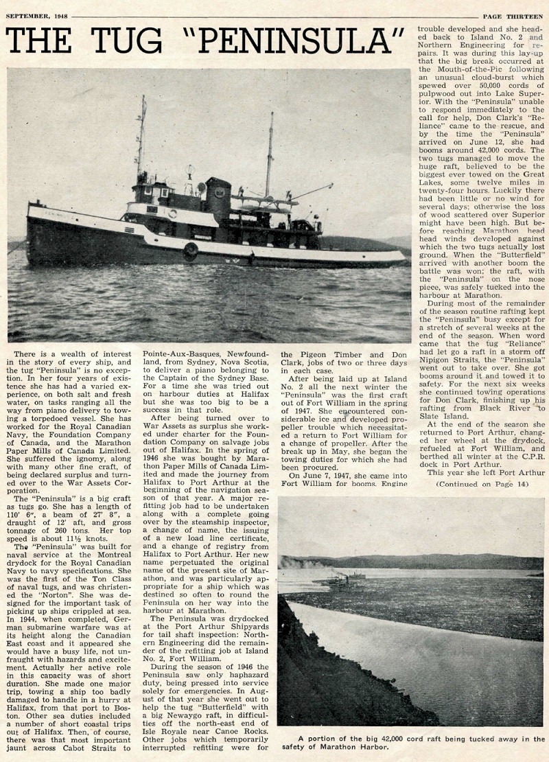 The NORTON was launched on 29 Nov 1943 by Mrs. B.S. (Gwendolyn) Hastings at the Montreal Dry Dock, Montreal, QC. She was sailed by the builders to Quebec City for completion, then to Halifax for commissioning. She started service early in 1944 and was active from St. John's, NFLD to Quebec City, to Yarmouth, NS. Some excerpts from the files at the LAC: "only tug available to salvage work in Western North Atlantic", "Arrival Halifax Tug NORTON with frigate Lanark in tow from Liverpool", "HMCS BEAVER (armed Yacht) in two from Halifax", "HMCS Tug NORTON towing battle class trawler HMCS FESTUBERT to Sydney". These entries along with many others showed that the NORTON was busy carrying out military duties during her life as an active Canadian Naval vessel towards the latter days of WWII, and, not without risk. In 1946, NORTON was declared surplus to requirements and turned over to the War Assets Corp. She was sold on 22 Mar 1946 to the Marathon Paper Mills of Canada Ltd., Port Arthur, Ont. She was later sold to the Gravel and Lakes Services Ltd Co of Thunder Bay, ON. Last heard in 2018, her certification lapsed a couple years back and is presently not in service. After being paid off she was renamed W.A.C. 1 and later Penninsula. On 07 Jul 2018, Penninsula sailed from Thunder Bay, ON to Marathon, ON, where he new owners, Marathon and District Historical Society will bring her ashore as a static display as a tribute to the towns logging history.
