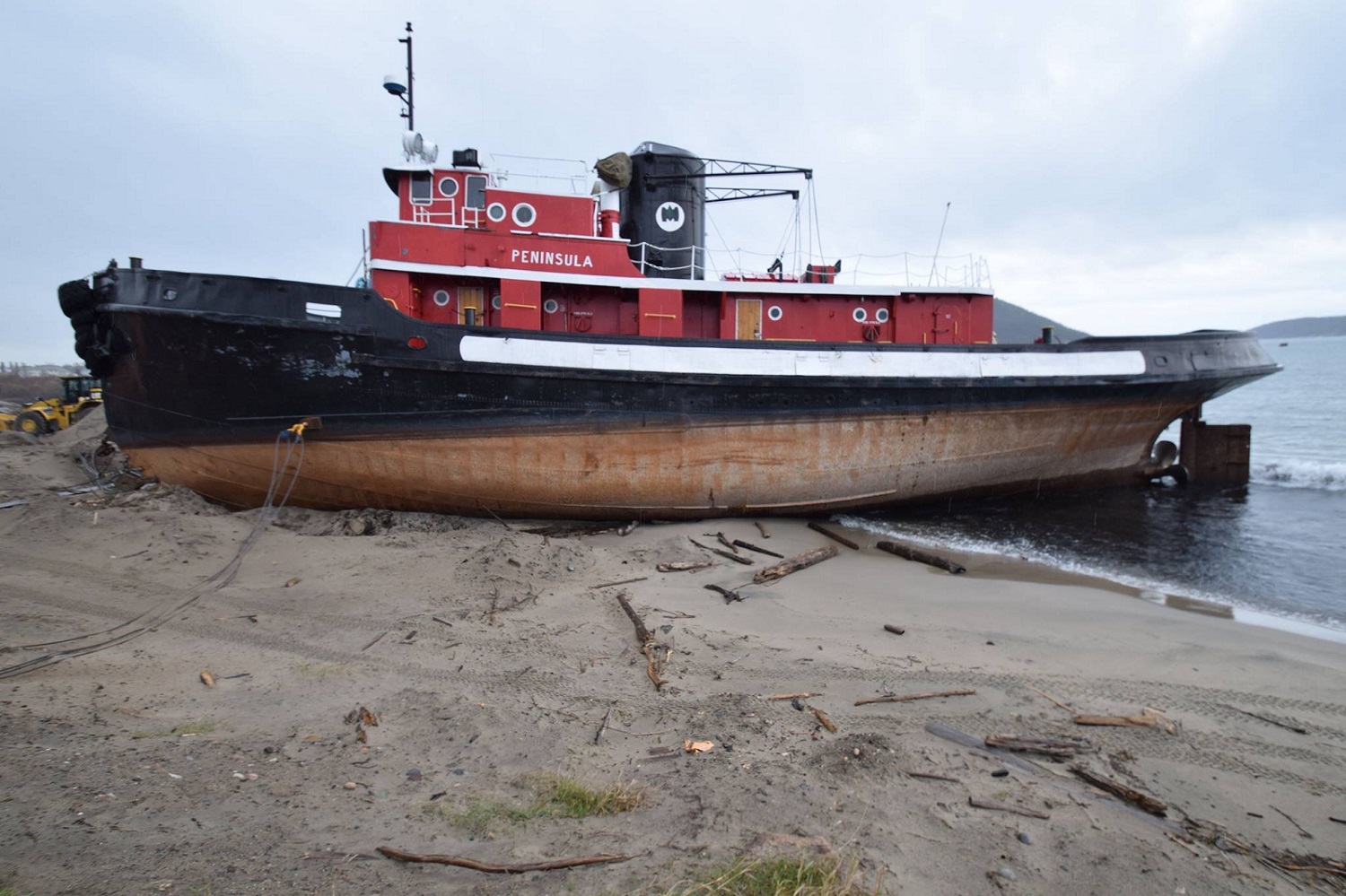 Update: Jul 2020 - the Town of Marathon, which earlier this month applied to Ontario’s Superior Court of Justice for an order that would allow the municipality to dispose of the 140-tonne vessel, possibly having it dismantled. The large tugboat leaning precipitously to one side on a Marathon public beach has become a “blight” and a “public safety hazard” and needs to be removed.