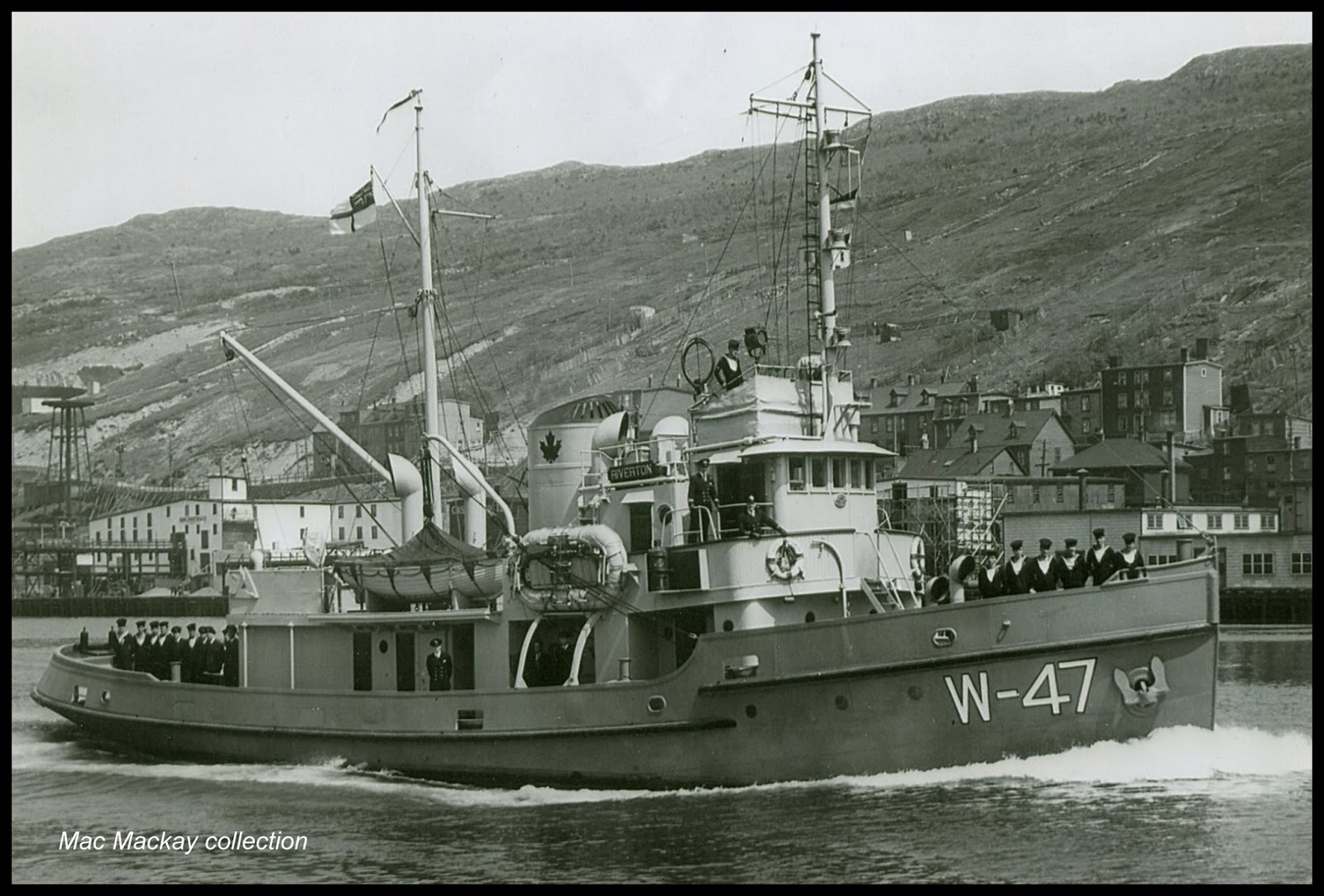 (RVT001) HMC Tug RIVERTON W47 at St. John's, Newfoundland // Source/ Credit: Tug Fax by Mac Mackay (RVT002) HMCS RIVERTON W47 at St. John's, Newfoundland // From the collection of AB William Cummings, RCNVR // Courtesy of Rob Cummings (RVT003) Chrysler Girls' Club adopts HMCS RIVERTON // The Chatham Daily News - Friday, 09 Jun 1944 // Officers in the photo: Lt Frank Gallop, RCNVR, Skipper Lt A.R. Hallet, CO of RIVERTON and Chief Lt F.J. Henderson, XO of RIVERTON // From the collection of Abraham Hallet, Skpr-Lt, RCNR // Courtesy of Sylvia Rose (RVT004) Techno St Laurent (former tug Riverton) - after 10 Years of languishing dockside at Gamble's in Port Colborne, ON she was pulled ashore on July 6, 2018 to be cut up // Photographer Jeff Cameron // Courtesy of Leigh Cossey