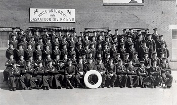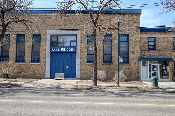 HMCS UNICORN is a Naval Reserve Division of the Royal Canadian Navy based in Saskatoon, SK. Established on 27 April 1923 as the Saskatoon Half-Company Royal Canadian Naval Volunteer Reserve (RCNVR) under the command of First World War veteran Lieutenant John McEown, UNICORN has been a cornerstone of Saskatoon for nearly a century. UNICORN was first quartered in the downtown armoury at 152 Spadina Ave, moving to the British Empire Service League building 403 21st E at the corner of 21st Street and 4th Avenue in June 1930. In 1934, the burgeoning ship's company moved again, to 378 1st Ave N the corner of 1st Ave and 25th Street to a former car dealership and garage . In 1935 was renamed The Saskatoon Division RCNVR. The ship moved to its present location in 1943, 405 24th St E, when a purpose-built brown brick building with white trim became Saskatoon's stone frigate at the corner of 4th Avenue and 24th Street, across from City Hall. On 1 November 1941 the unit was commissioned as HMCS UNICORN, and in 1948 it received is official crest.