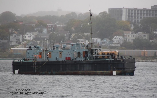 Barge YDG-2 being towed out of Halifax to the breaker's yard in Sydney, NS Source: Tugfax blogspot © Mac Mackay 10-10-2018 Click on the above photo to view a larger image