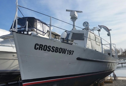 Built in 1954 at Owen Sound, Ont., YMU-116 served as a tender to HMCS HUNTER, HMCS PREVOST, HMCS York and HMCS CATARAQUI from approx 1969 to 1995. She was renamed Crossbow approx 1976 - the name coming from the crossbow in HMCS Hunter's badge. Final disposition unknown.