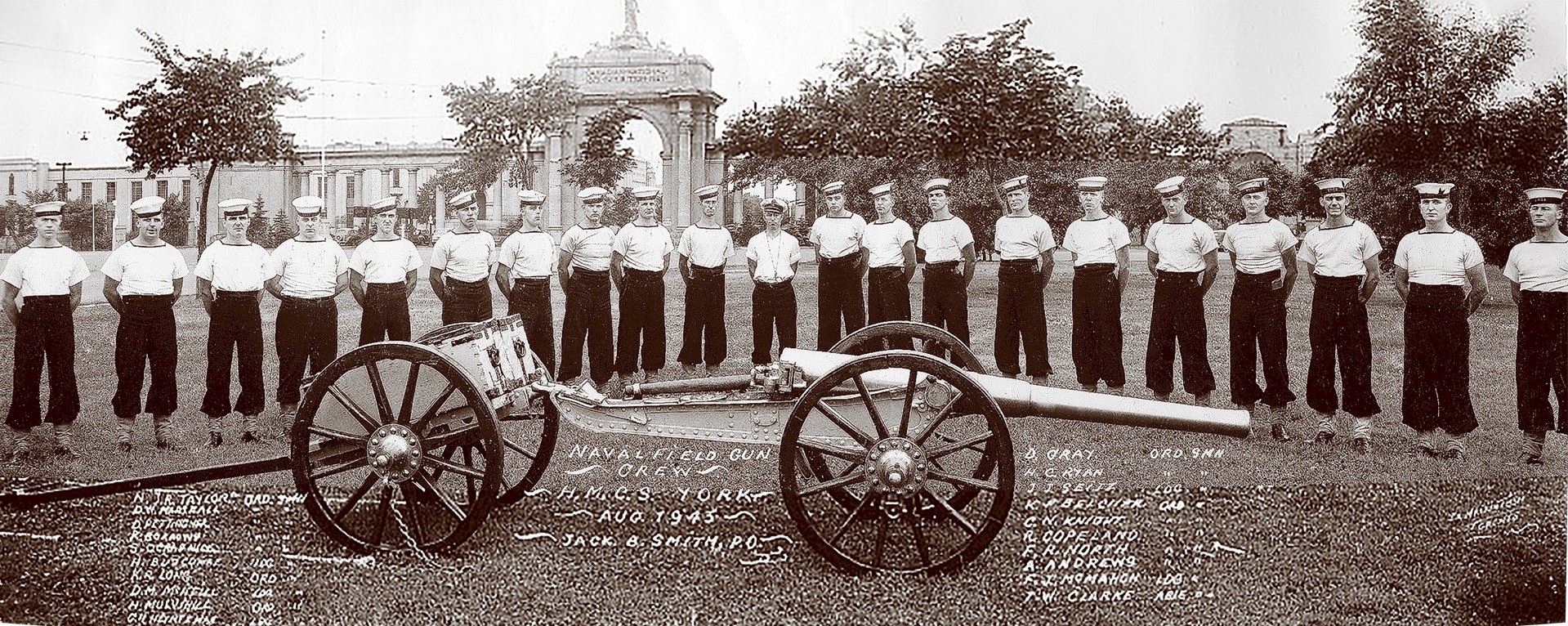 (FB06) HMCS York Naval Field Gun Crew, Aug 1943, Frank Belcher, 7th from right Source: Ian MacNeill Collection, Ancestry.com
