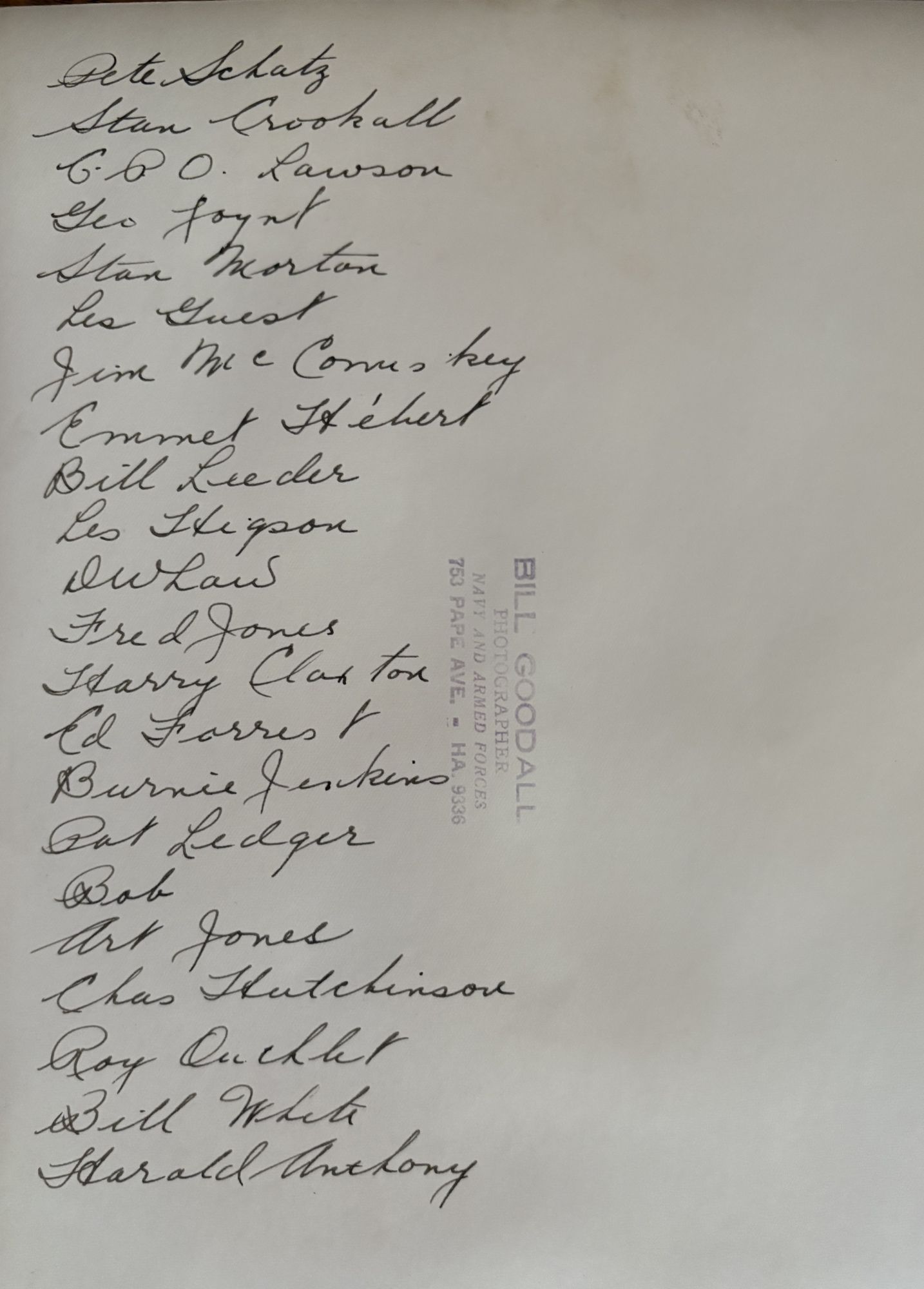 Names written on the back of the photo - not in photo numbered sequence: Pete Schatz, Stan Crookall, CPO Lawson, George Joynt, Stan Morton, Les Guest, Jim McCommkey (?sp), Emmet Hébert, Bill Leeder, Les Higson, D.W. Law, Fred Jones, Harry Claxton, Burnie Jenkins, Pat Ledger, Bob, Art Jones, Chas Hutchinson, Roy Outhlet (?sp), Bill White, Harold Anthony