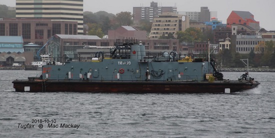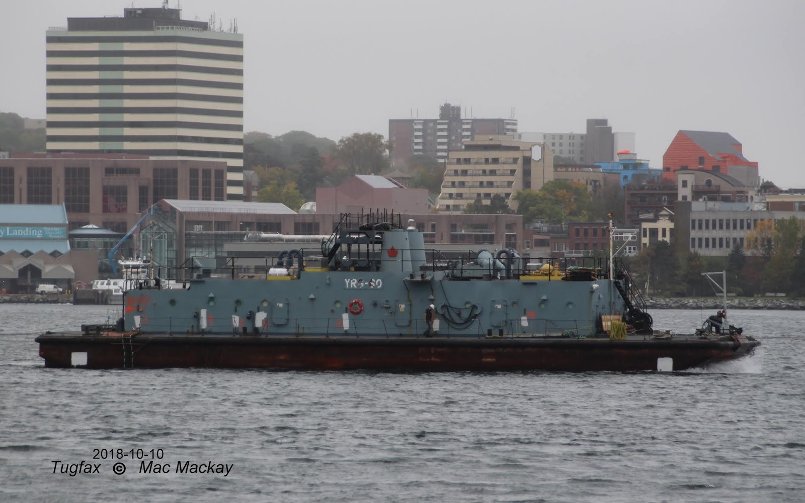 Fueling Barge YRG-60 being towed out of Halifax to the breaker's yard in Sydney, NS Source: Tugfax blogspot © Mac Mackay 10-10-2018 Click on the above photo to view a larger image