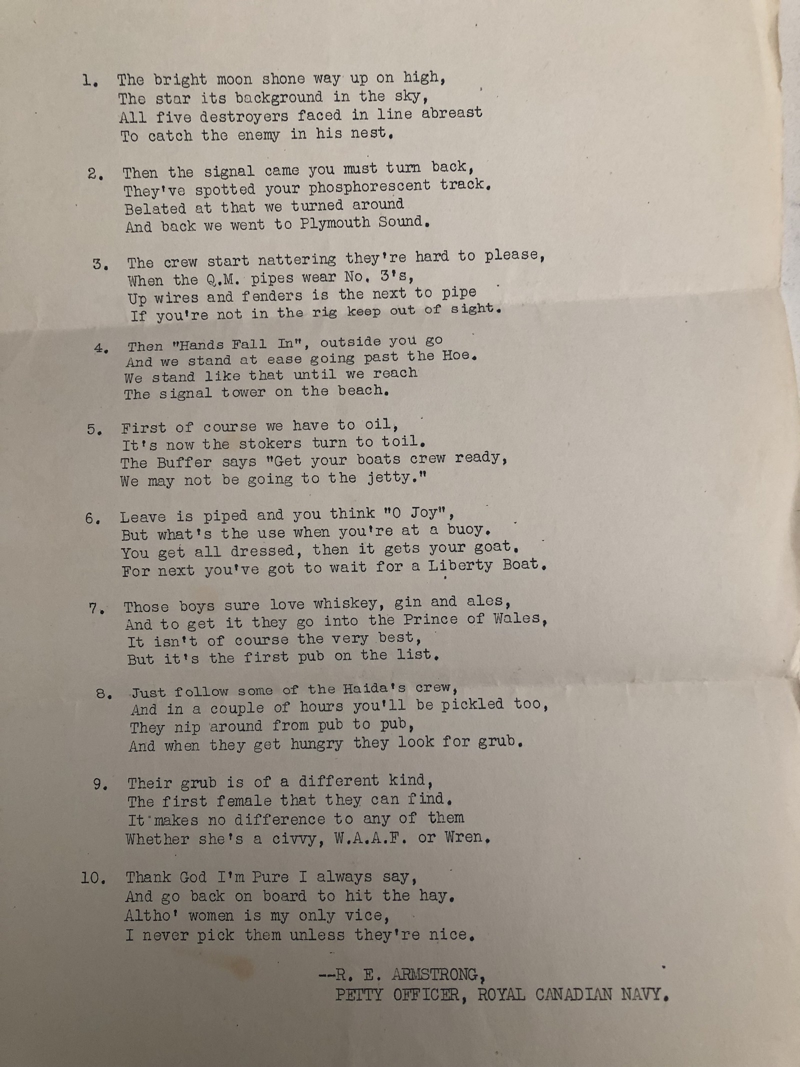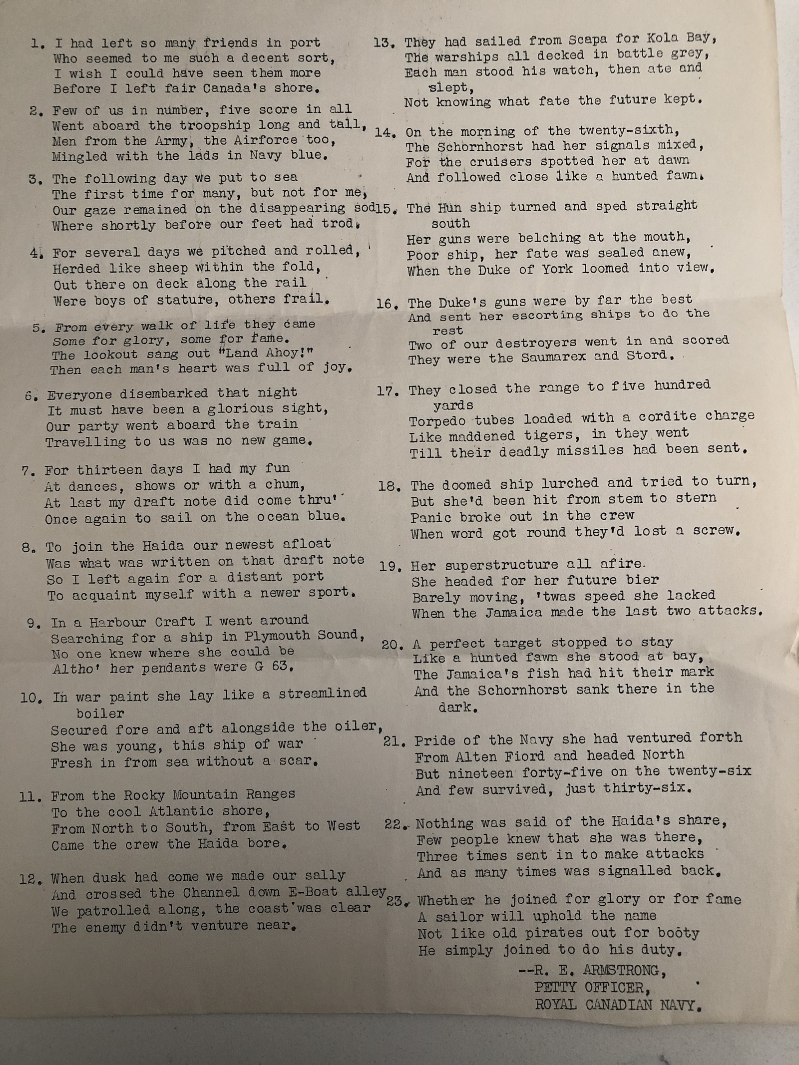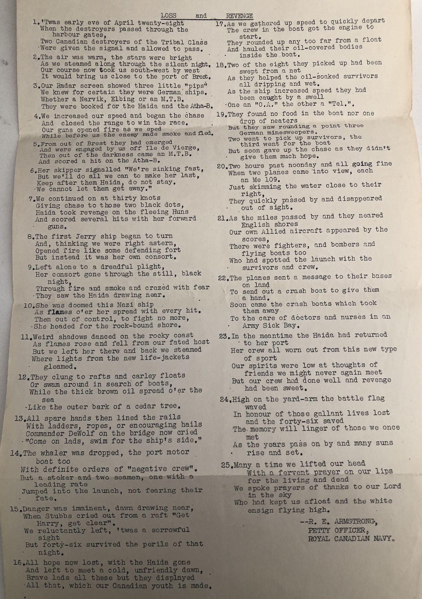 * Loss and Revenge - the sinking of HMCS ATHABASKAN and the revenge exacted on German minesweepers by R.E. Armstrong, PO, RCN * OM's Course Nineteen by John Thompson * Poem about a sailor who joined HMCS HAIDA by R.E. Armstong, PO, RCN * Poem about HAIDA'S crew by R. E. Armstong, PO, RCN * The Phantom Fleet by Buster Brown * Three Fighting Tribals (HAIDA, HURON, ASHANTI) * Beloved Halifax Nova Scotia ..... You Stink!