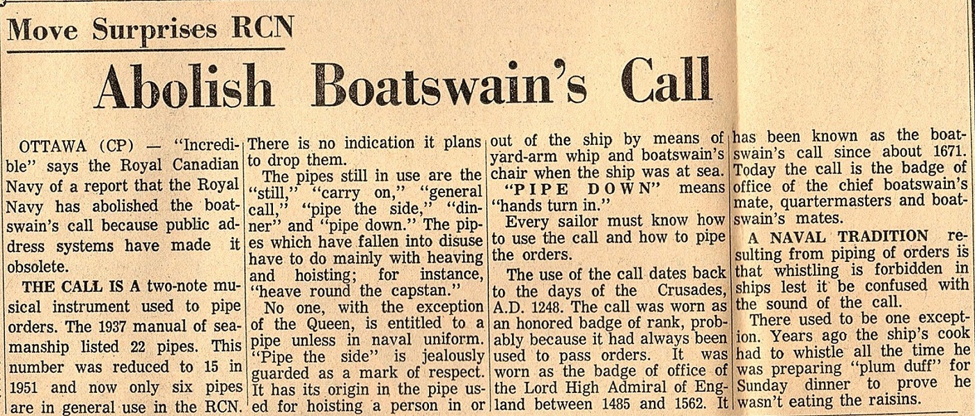 Royal Navy Abolish Boatswain's Call Move Surprises RCN The Hamilton Spectator 15 May 1963