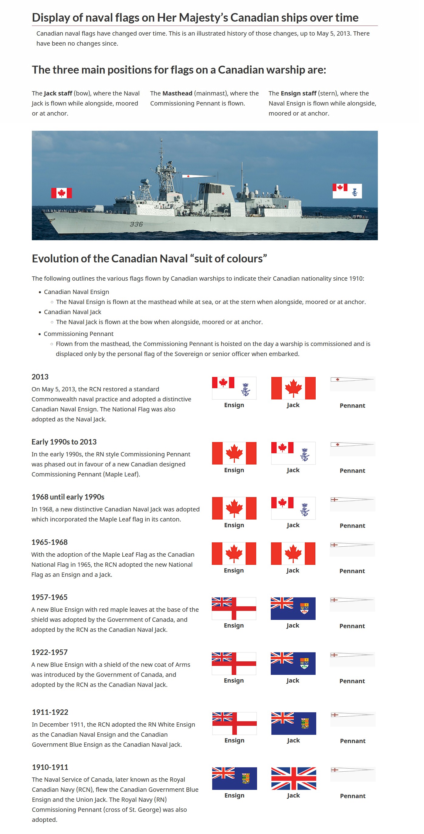 Auxiliary Oiler Replenishment - Information Note - 12 Dec 2017 Badges or Crests - a definitive answer - Information Note - 22 Mar 2018 Barber Pole (The) - Information Note: 22 Jul 2020 Canadian Warship Acceptance - Information Note: 15 Jul 2020 Keel Laying- Information Paper - 10 Jan 2020 Naval Camouflage and its Application - Information note 24 Mar 2020 Paying-off of HMC Ships - Information Paper - 14 Oct 2016 RCN Ship Pennant Numbers - Information Note - 09 Jan 2023 Royal Canadian Navy Ship's Badge - Information Note - 22 Mar 2018 Warship Orthography - Conventions in Writing Warship Name - Information Note - 08 Jan 2020