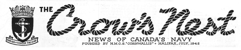 The Crow's Nest newspaper was founded in July 1942 and was published every month by HMCS CORNWALLIS "by kind permission of Captain J.C.I. Edwards, RCN". Printed by the Truro Printing & Publishing Company Limited, the Crow's Nest was a chronicle of the Royal Canadian Navy's wartime activities.
