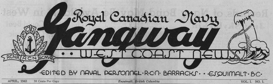 The first issue of the Gangway was published in April 1943 and was the newspaper for the RCN's west coast fleet and shore establishments. The 4 issues of the Gangway newspaper here are from the collection of William Randall McLean and were donated to For Posterity's Sake courtesy of Derwyn Crozier-Smith. The newspapers from this collection have been sent to the CFB Esquimalt Naval and Military Museum for preservation. They scanned them and have graciously provided copies of the PDF files for sharing here.