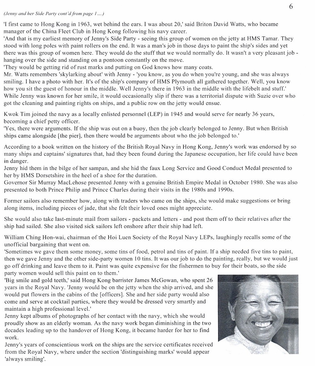 of sailors who visited Hong Kong will mourn the death of Jenny. She was a much