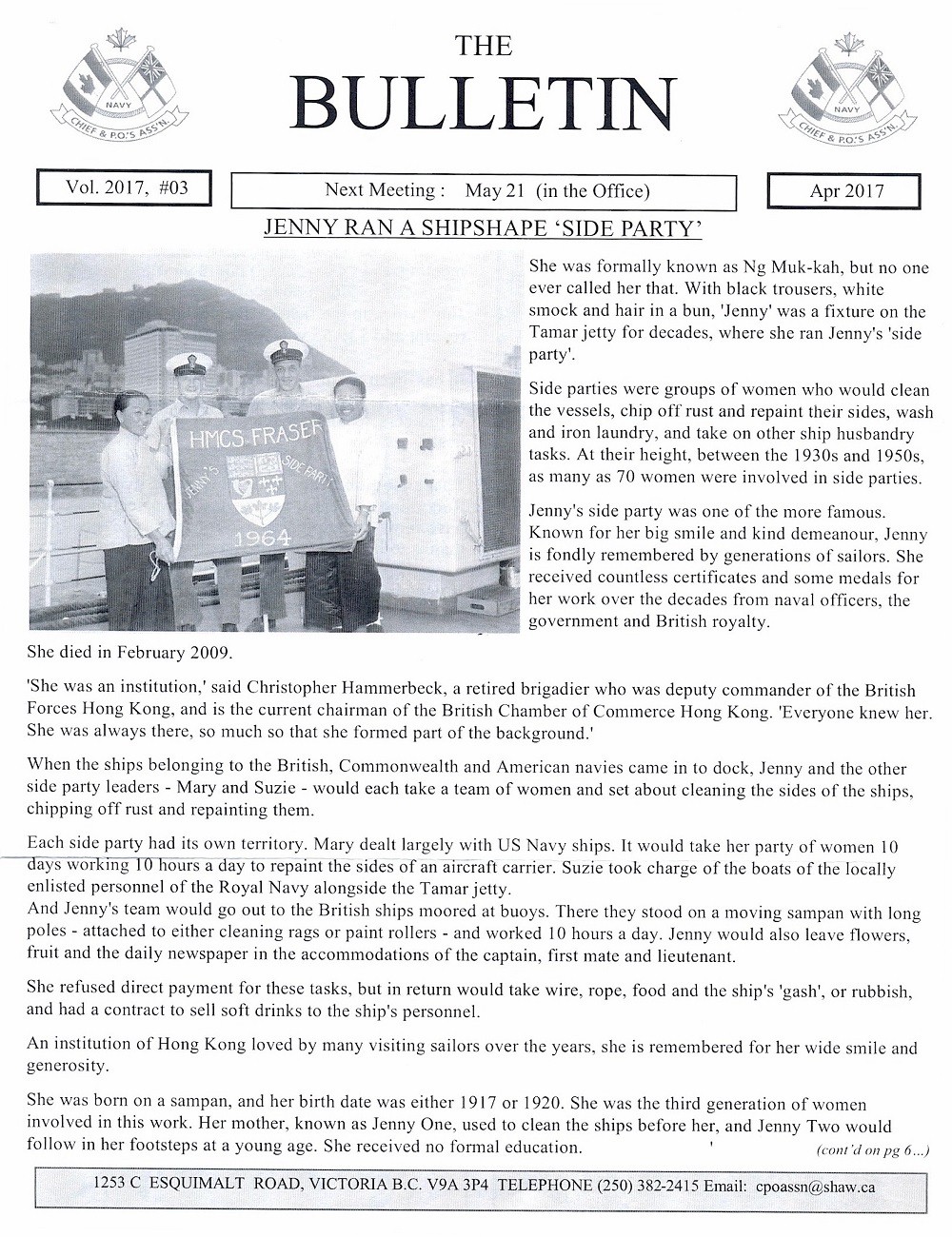 and Petty Officers' Association (Esquimalt) newsletter Bulletin" article on Jenny's Side party - Page