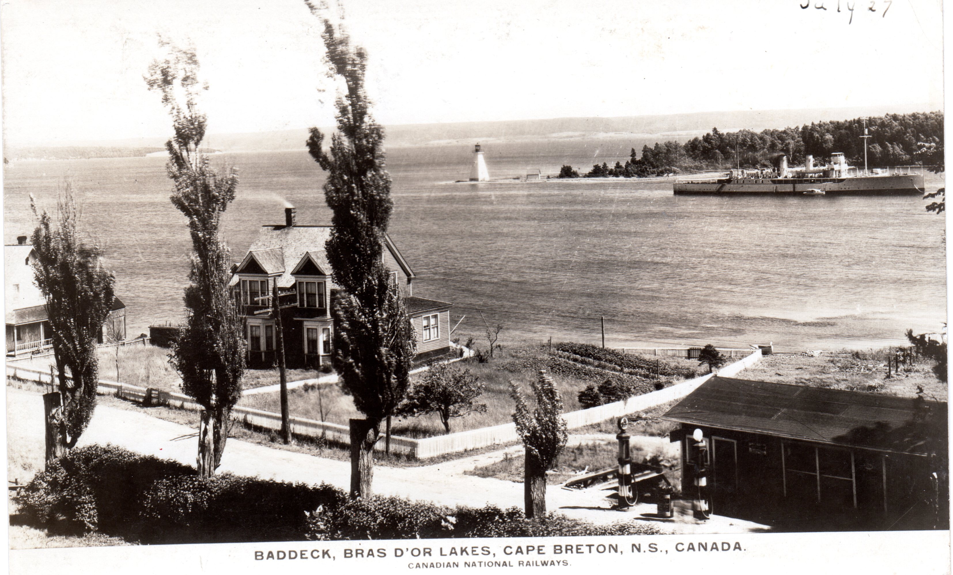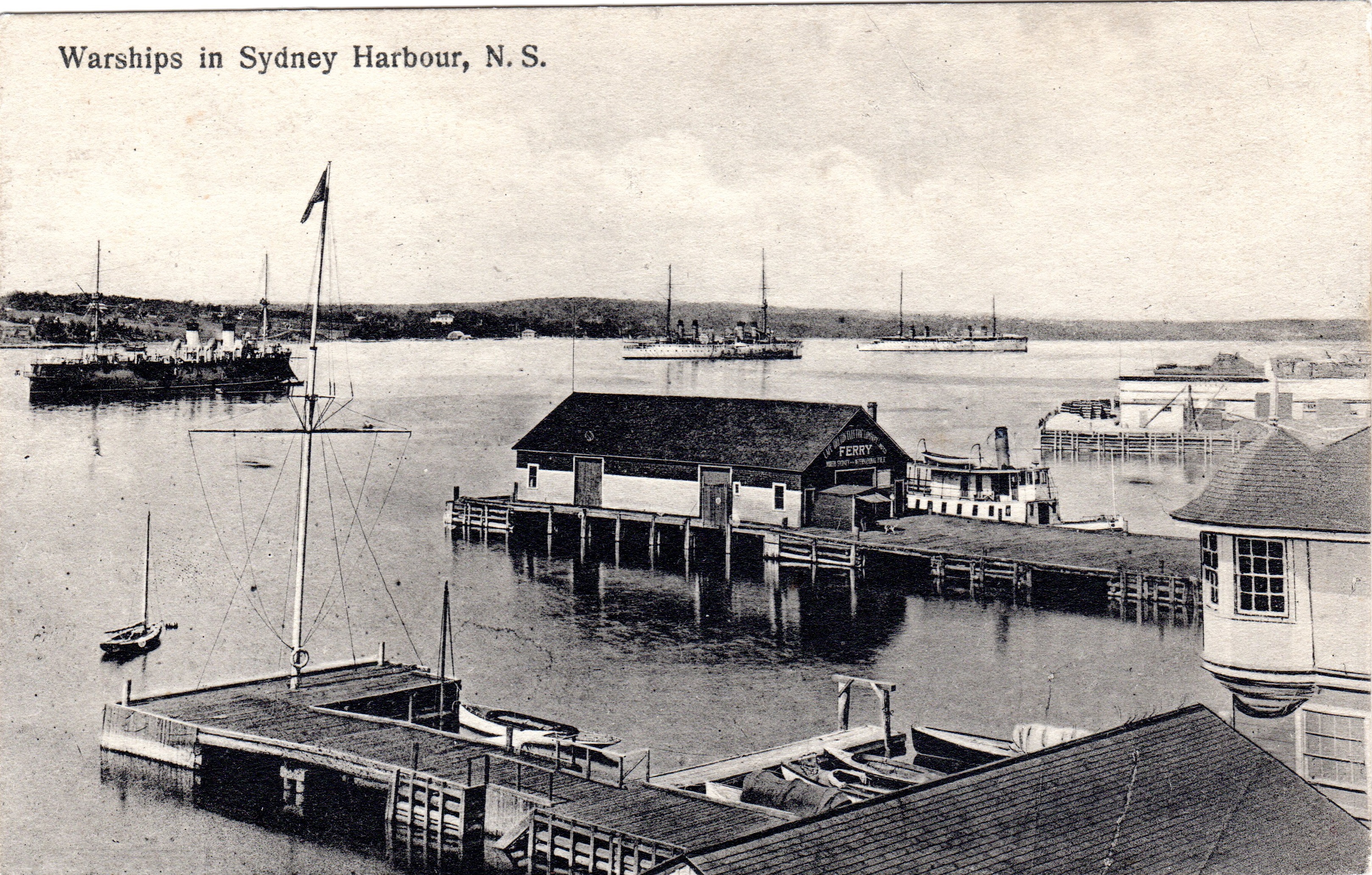 (O&S034) Photo postcard of a Royal Navy warship on the Brad D'Or Lakes. Courtesy of Peter German. Webmaster's note: The ship appears to be a First World War design Flower Class Sloop. Postcard estimated to be between 1926 and 1932. (O&S035) Photo postcard of warships in Sydney Harbour, NS. Courtesy of Peter German. Webmaster's note: If my identification of the ships is correct, the one on the left appears to be a French Linois Class cruiser and the two on the right Dupleix Class armoured cruisers. This would put the postcard between 1903 and 1917.