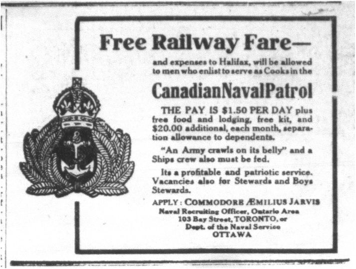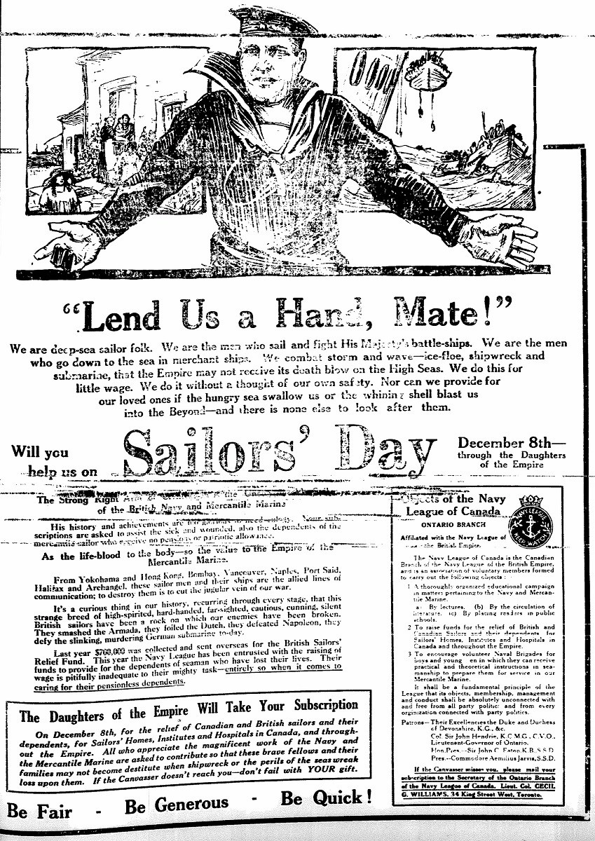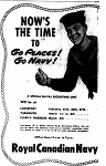 (O&S029) British Sailors Relief Fund Ad. The Picton Gazette, 06 Dec 1917. Source: Prince Edward County Archives Microfilm collection. Researched and complied by: © John Lyons 2016 (O&S030) Recruiting ad from the Halifax Chronicle-Herald - 1954. Courtesy of George Newbury (O&S031) Recruiting ad from the Halifax Chronicle-Herald - 1954. Courtesy of George Newbury (O&S032) RCN recruiting poster - 1958 (O&S033) Collection of matchbook covers. Courtesy of Steve Hlasny
