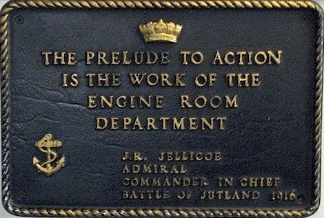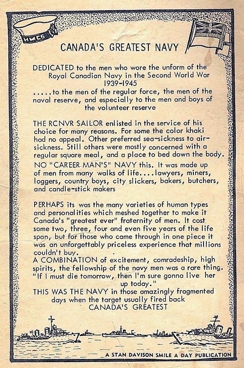 (O&S006) Memories of days gone by - Bar hours for the mess. Courtesy of Daryl Skaalrud (O&S007) Pussers Corner, Victoria, BC, 1948 - "Anyone who took New Entry Training at Naden in that era or who were stationed on West Coast ships will remember Cunningham Drugstore. That was the reference point for anyone meeting up in downtown Victoria". Courtesy of Francis Dowdall (O&S008) Olympic Gardens, Halifax, 1954 - It was July/August 1954 and I had just returned to Halifax from a Gunnery deployment to Bermuda, aboard Micmac DDE 214. The day after I was in Stadacona, awaiting a draft ashore, and as luck would have it, duty watch, Shore Patrol. A USN fleet carrier was in, believe it was Bennington CV 20, and the town was jumping. Olympic Gardens was packed with matelots, USN and RCN. It was a brutally hot day and the beer was flowing. We had seven or eight Hands in wagon, a few of them from Micmac. One of them tossed his cookies; the remainder pleaded to have the door open for air. I was the Leading Hand of the patrol and opened the door. Wham the door was kicked wide open and three or four scampered from the scene, never to return. The P1 in charged was good about it and let it go. Courtesy of Gerald Sullivan (O&S009) The prelude to action is the work of the Engine Room Department - Admiral Jellicoe. This plaque is found onboard all RCN ships in or near the Engineering spaces. (O&S010) Naval Service of Canada Recruiting Poster