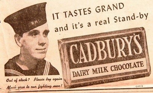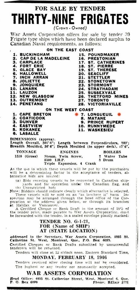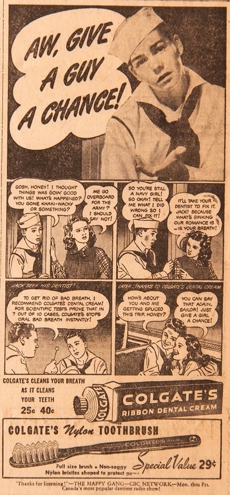 (O&S016) Cadbury's ad during WW II from the Okotoks Review, Okotoks, Alberta. Courtesy of Anne Gafiuk (O&S017) Colgate ad during WW II from the Okotoks Review, Okotoks, Alberta. Courtesy of Anne Gafiuk (O&S018) Tender notice for the sale of 39 frigates in 1946. Courtesy of Doug Benson (O&S019) A Correctly Dressed Rating (O&S020) RCN Armament Depot jacket Patch. Courtesy of Hugh Muir