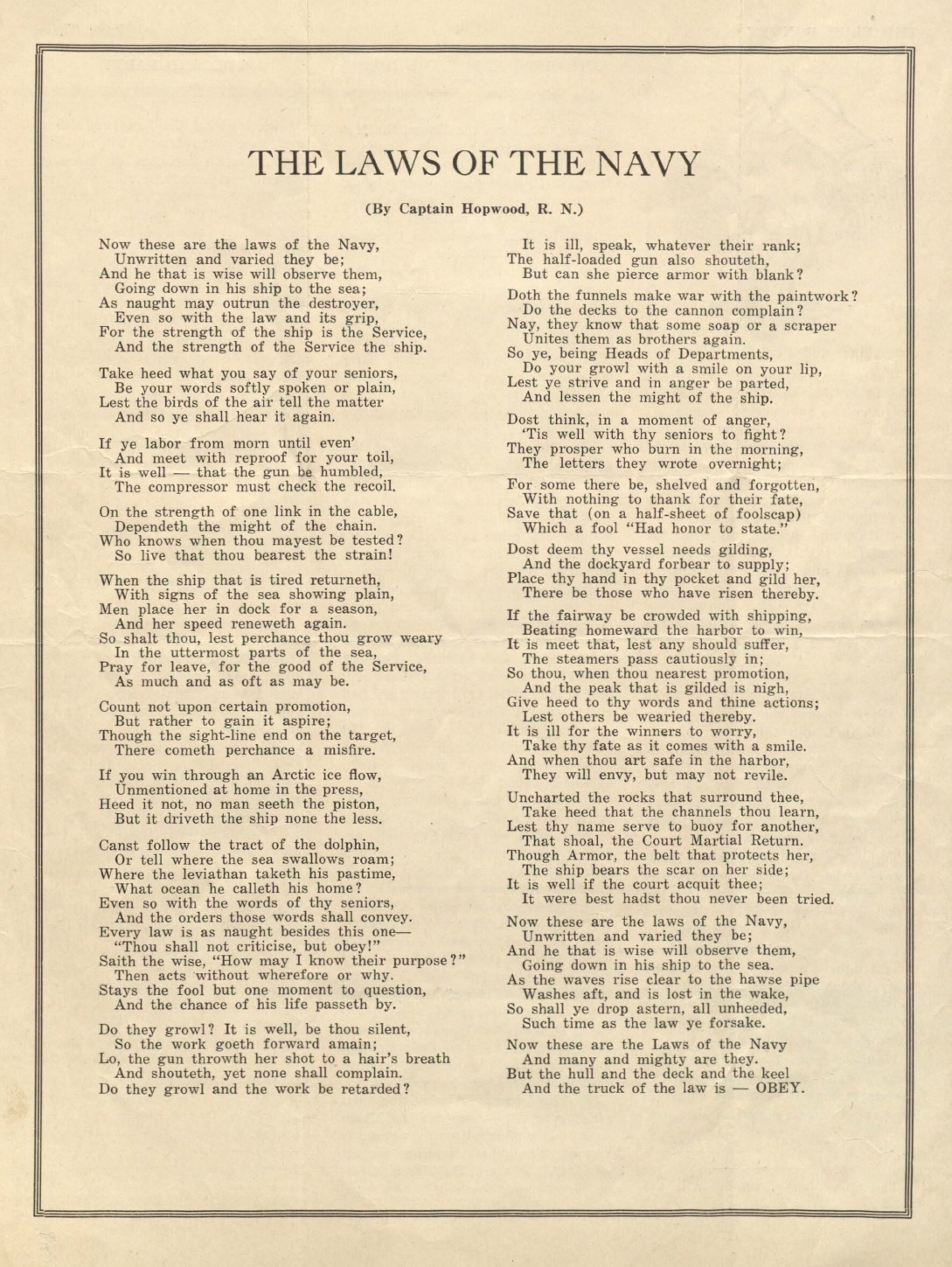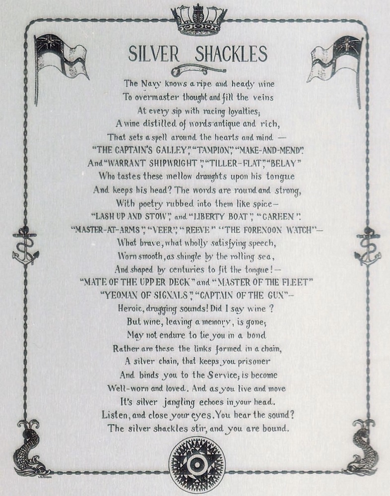(O&S023) The Convoy Signalman - by Convoy Yeoman R. Collins. Crow's Nest newspaper - May 1944 (O&S024) Laws of the Navy. Courtesy of Dean Lang (O&S025) Poem - Silver Shackles. Author unknown. Courtesy of James Jenson (O&S026) A sample of a Crossing the Line certificate - one of many different ones used. Courtesy of Robert DeWolfe (O&S027) Twelve sketches by artist Percy Beer on various naval scenes (pdf file)