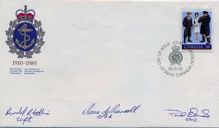 Fast forward some 25-30 yrs - I head from someone that said he knew a guy who was a model for the drawing. I thought that was cool. I found him (the model) on DND email and sent him an email. He remembered it and said that all the people that modelled were still in the Halifax area and he named them. The girl was a military bandsman (sic) that I'd met as a Naval Reservist in the Massed Bands in 81 and 82 in Halifax. So I sent him my FDC and asked if he could get his old friends to sign the cover. He did! Capt (then PO2) Folkins is the guy in 1910, CPO2 Paul Edwards is the WW11 Naval officer and CPO2 Dianne DeRosenroll is the female sailor.