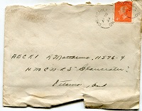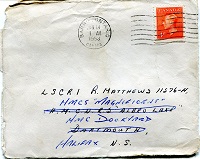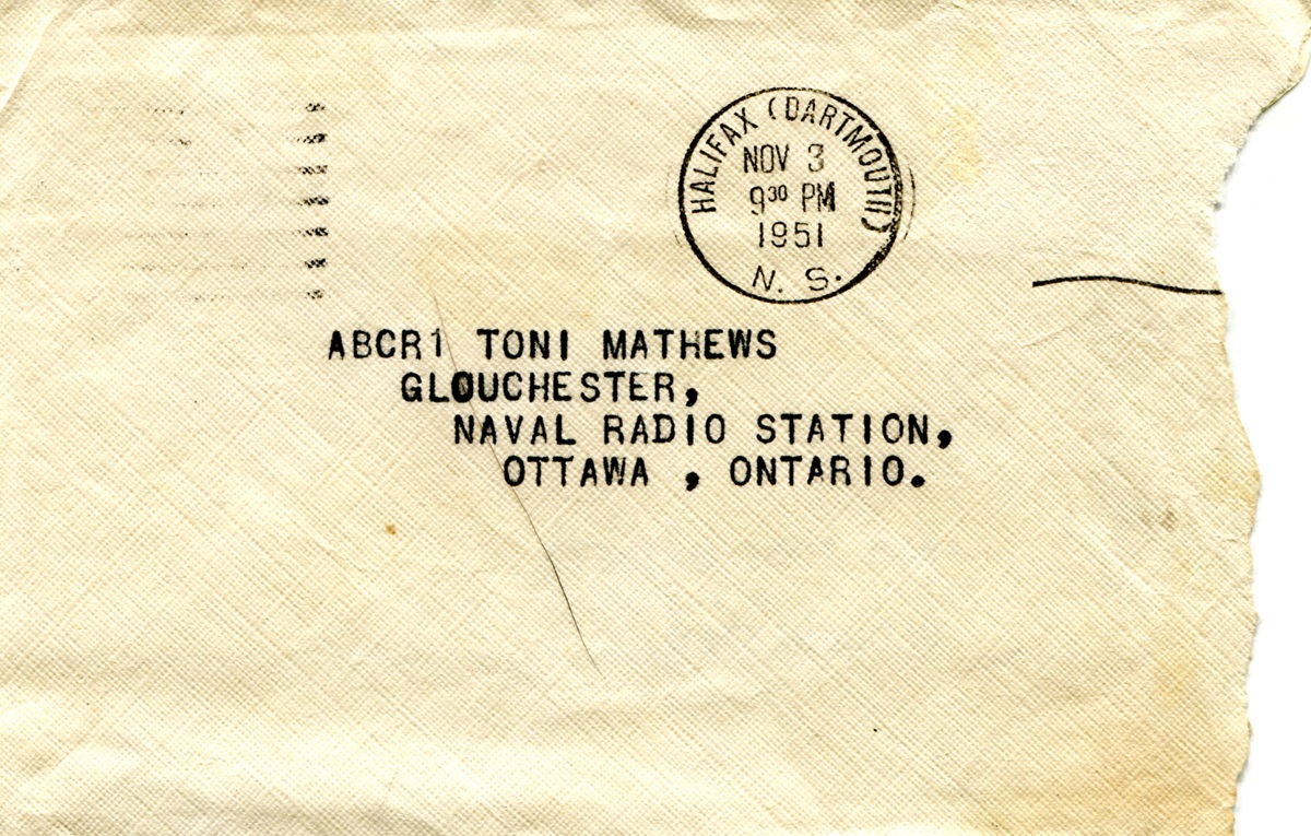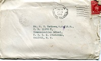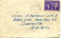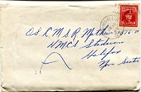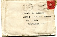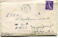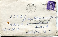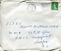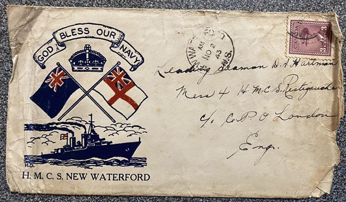 HMCS NEW WATERFORD envelope addressed to LS D.A. Hartman, Mess 4, HMCS RESTIGOUCHE Postmarked 02 Nov 1943, New Waterford, NS Courtesy of Michael Erwin