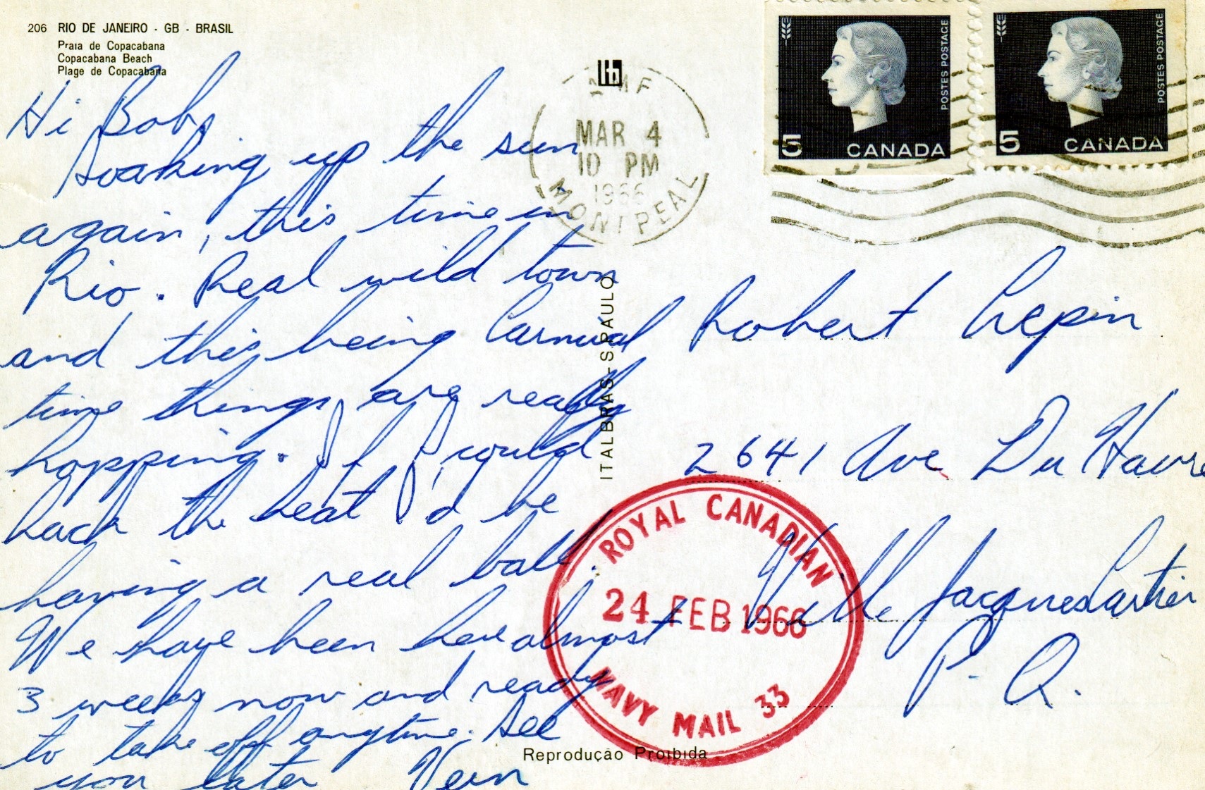 Postcard sent from Rio in Feb 1966. Navy Mail 33 was HMCS CAPE SCOTT Courtesy of Peter McCarthy