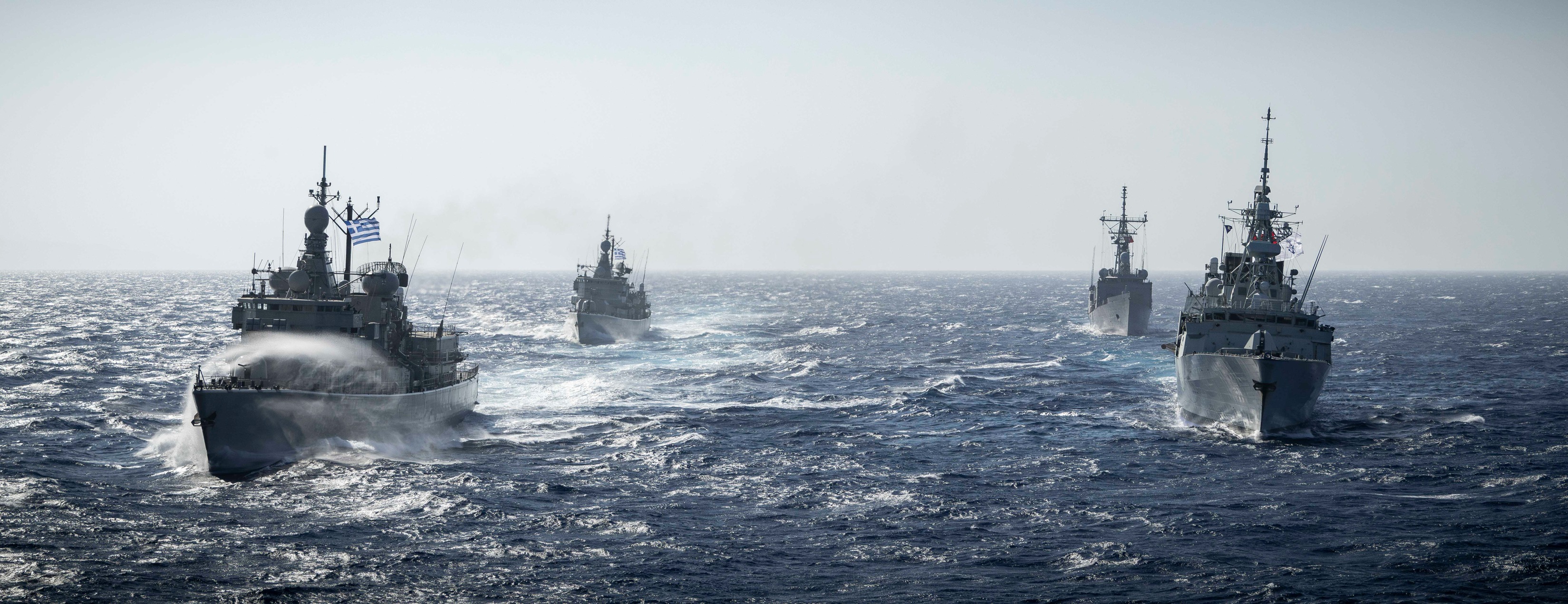 HMCS Charlottetown, Flagship of Standing NATO Maritime Group Two, sails with consort ships Turkish Naval Ship TCG Gaziantep, Greek Naval Ships HS Limnos and HS Nikiforos Fokas conduct operational patrols in the Aegean Sea during Operation REASSURANCE on 19 July 2024. Photographer: Aviator Gregory Cole, CF Photo