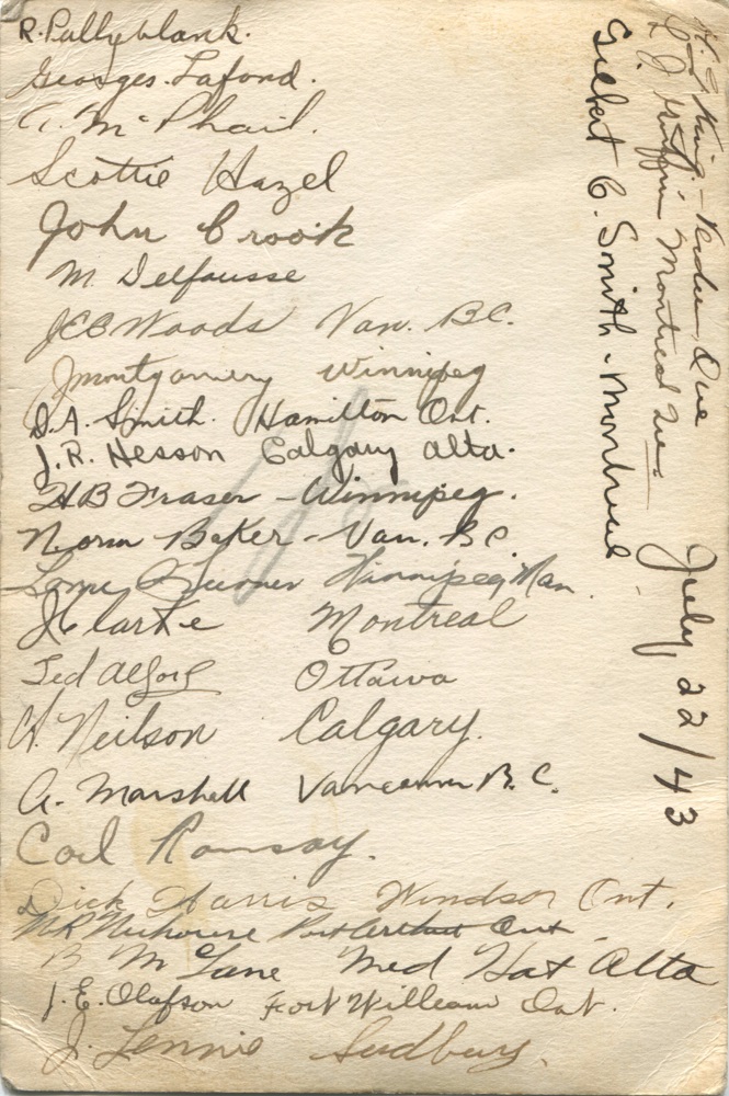 (1) Tessier, L. (2) Winter, E. (3) McRae, Ken (4) Wolfe, J. (5) Arnold, SLt (6) Norman, Pat (7) McPhee, C. (8) Payne, A.G. (9) Smith, V.H. (10) Stone, Robert (11) Cuish, H.Mc. (12) McNee, George (13) Pelland, P.E. (14) Zentner, J. (15) Wilson, J.D. (17) O'Malley, Gil (18) Kinch, J.E. (19) Norman, H.G. (20) Ring, Don (21) McDonald, H.G. (22) Sheppard, R.H.